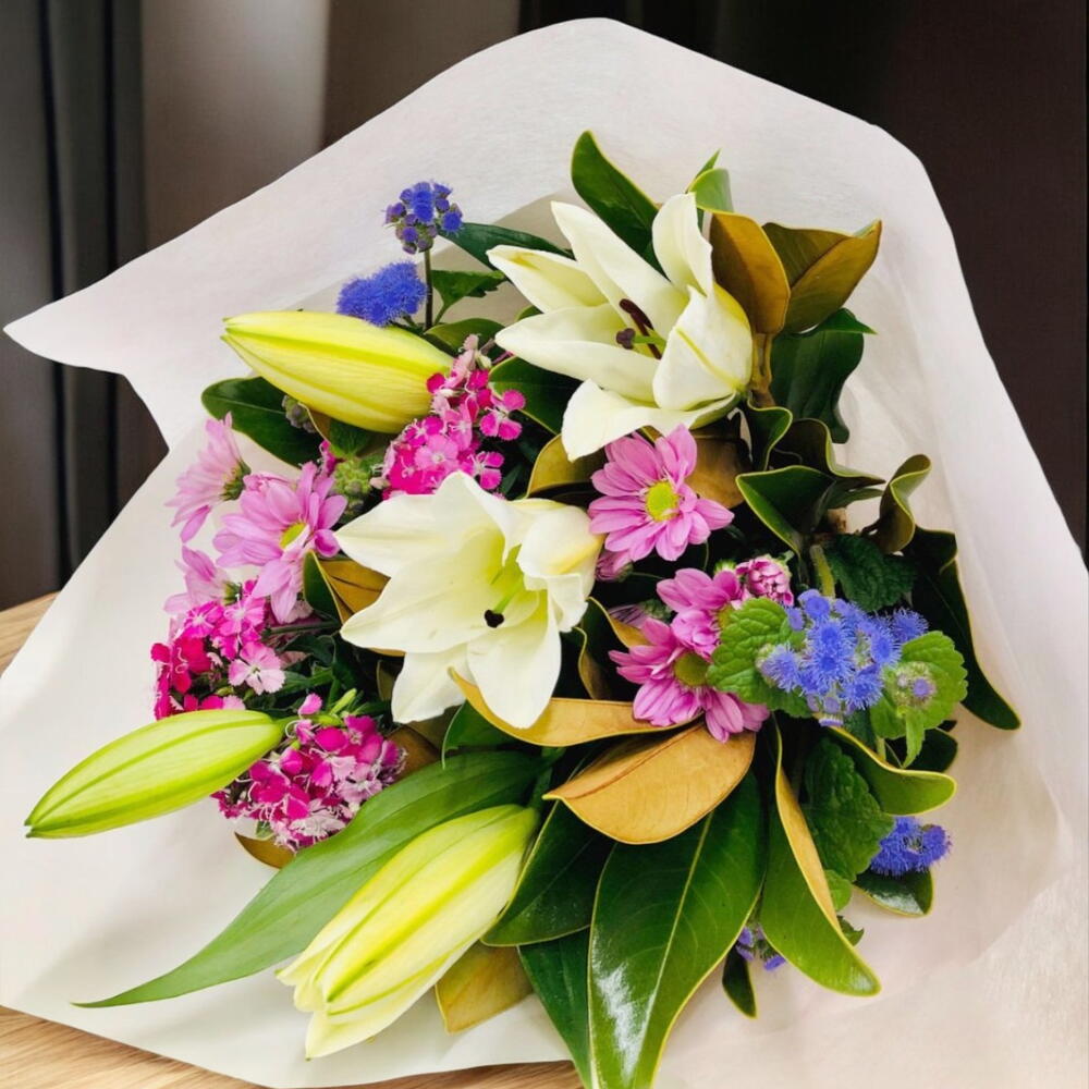Ce charmant bouquet associe l'élégance des lys blancs à la fraîcheur de fleurs aux tons vibrants de rose, pourpre et bleu. Accompagné d'un feuillage vert éclatant, cet arrangement transmet un mélange parfait de délicatesse et de vitalité. Idéal pour les célébrations, les anniversaires ou pour surprendre quelqu'un de spécial, son design plein de couleur illumine tout espace. Enveloppé dans du papier blanc qui met en valeur sa beauté naturelle, c'est un cadeau sophistiqué et chargé d'émotions. Offrez ce bouquet et remplissez la journée de joie et d'élégance! Magnifique et élégant bouquet de fleurs variées