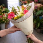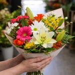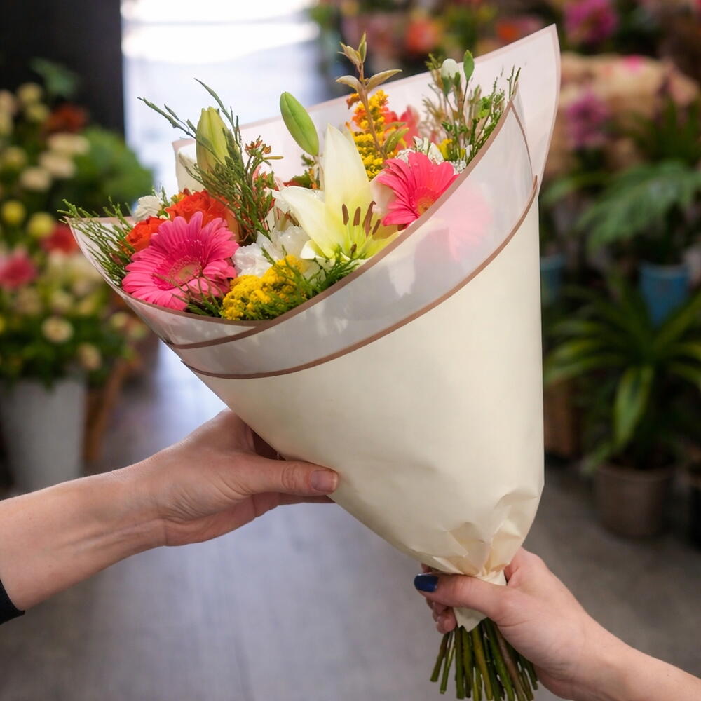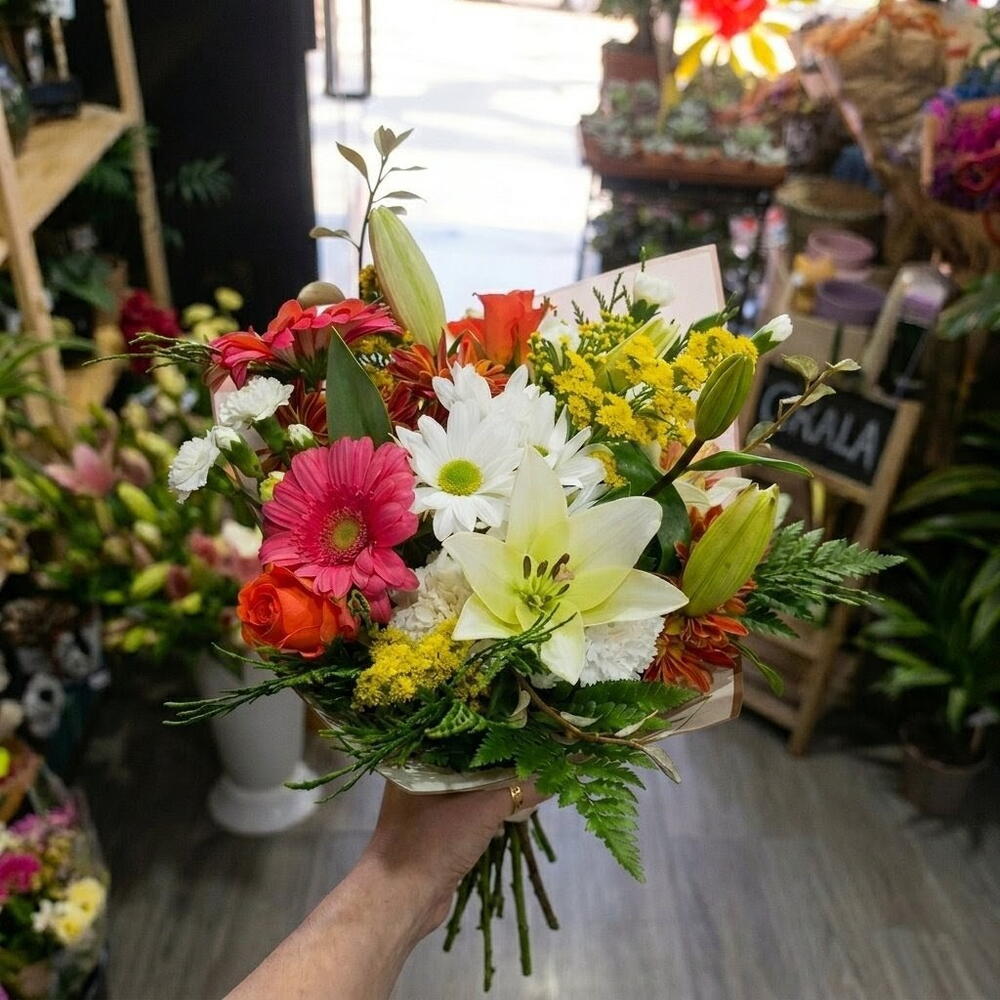 Ramo del Florista – Flores de Temporada Deja que el florista cree por ti. Este ramo está diseñado siguiendo el estilo de la imagen: alegre, natural y lleno de color, combinando flores como liliums, rosas holandesas, gerberas, margaritas, dianthus, solidago y verdes frescos. Cada ramo es único. Las flores se seleccionan según disponibilidad en tienda para garantizar máxima frescura y calidad, por lo que la composición puede variar ligeramente, manteniendo siempre la estética, gama de colores y volumen del modelo. Ideal para regalar sin complicaciones: el florista se encarga de todo. 💐 Hecho a mano en Paseo Botánico 🌿 Flores frescas de temporada 🚚 Entrega en Granada capital