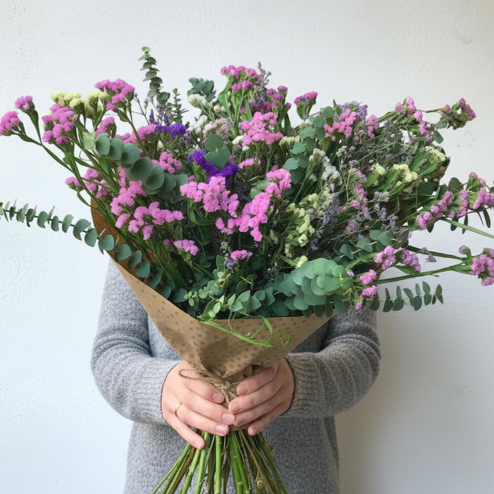 ramas de eucalipto - 5 pce tiges de statice rose - 6 pce branches de statice mauves - 4 pce branches de statice blanc - 3 pce tiges de statice jaune - 3 pce