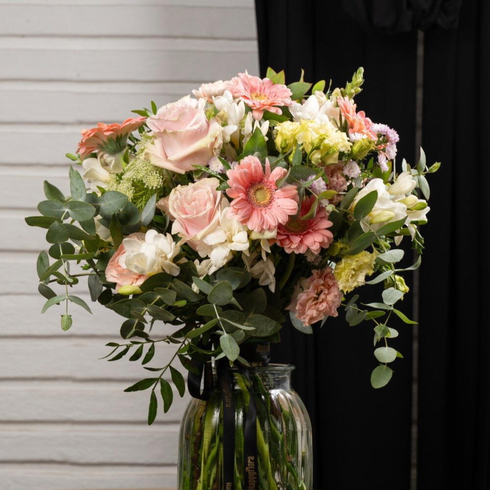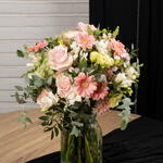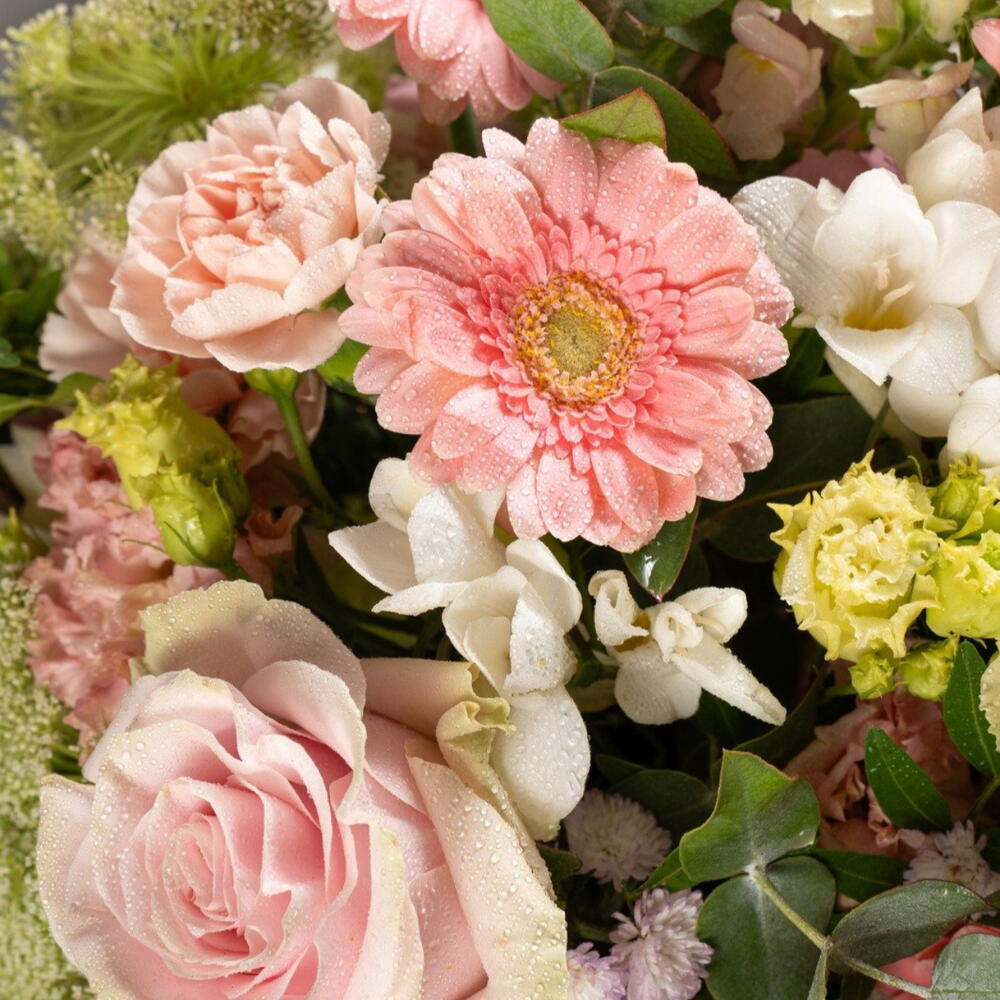 Gérbera roses - 3 pce alstroemère blanche - 3 pce eucalyptus frais - 4 pce feuillage décoratif vert - 3 pce rosas frescas rosadas - 4 pce flores decorativas verdes (crisantemo verde o similar) - 2 pce
