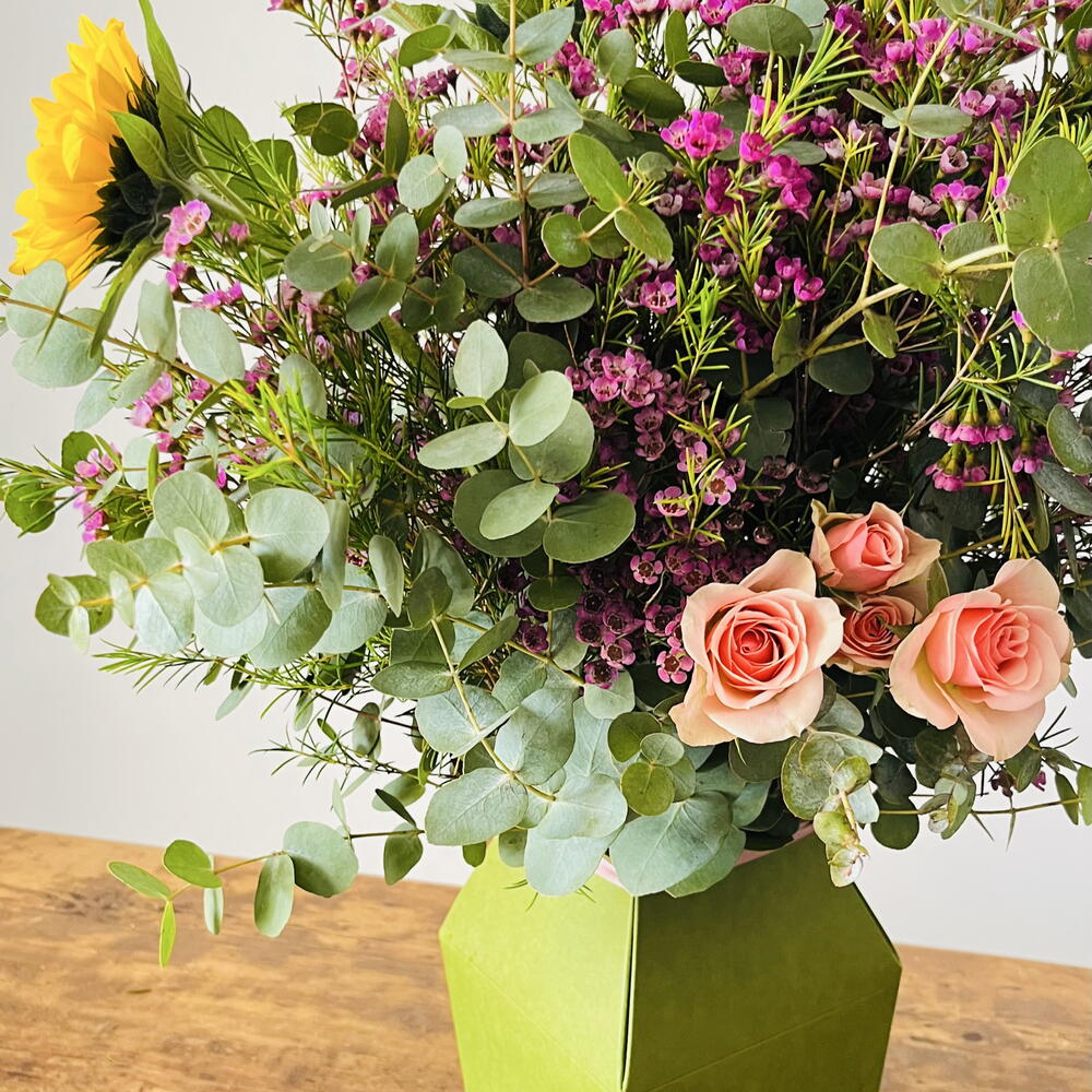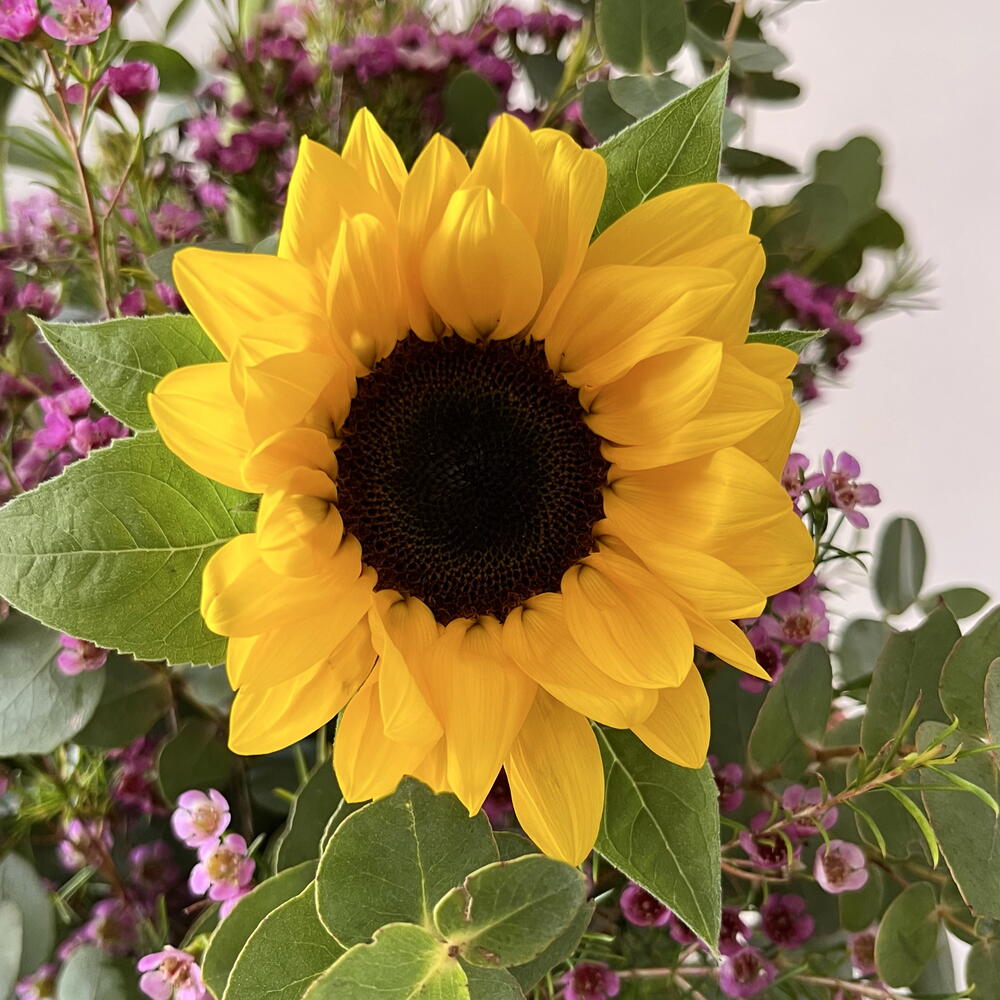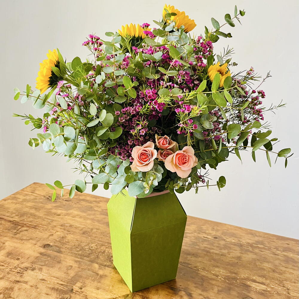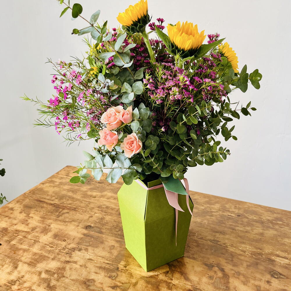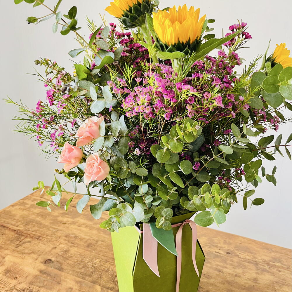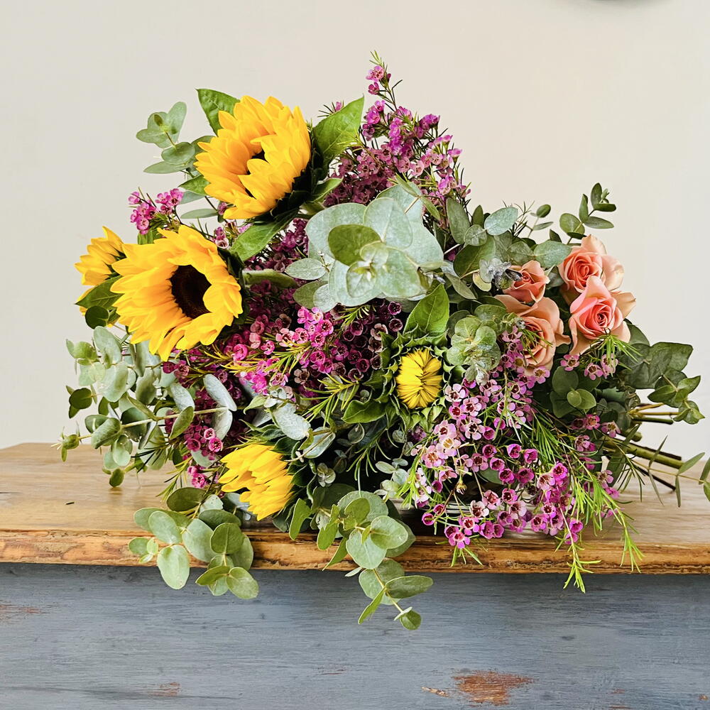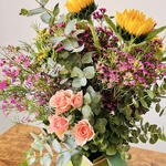 Un bouquet sauvage débordant de vitalité et de couleurs grâce au tournesol, et empreint de douceur grâce à la chaleur de la fleur de cire et de la rose ramifiée.