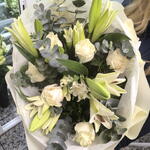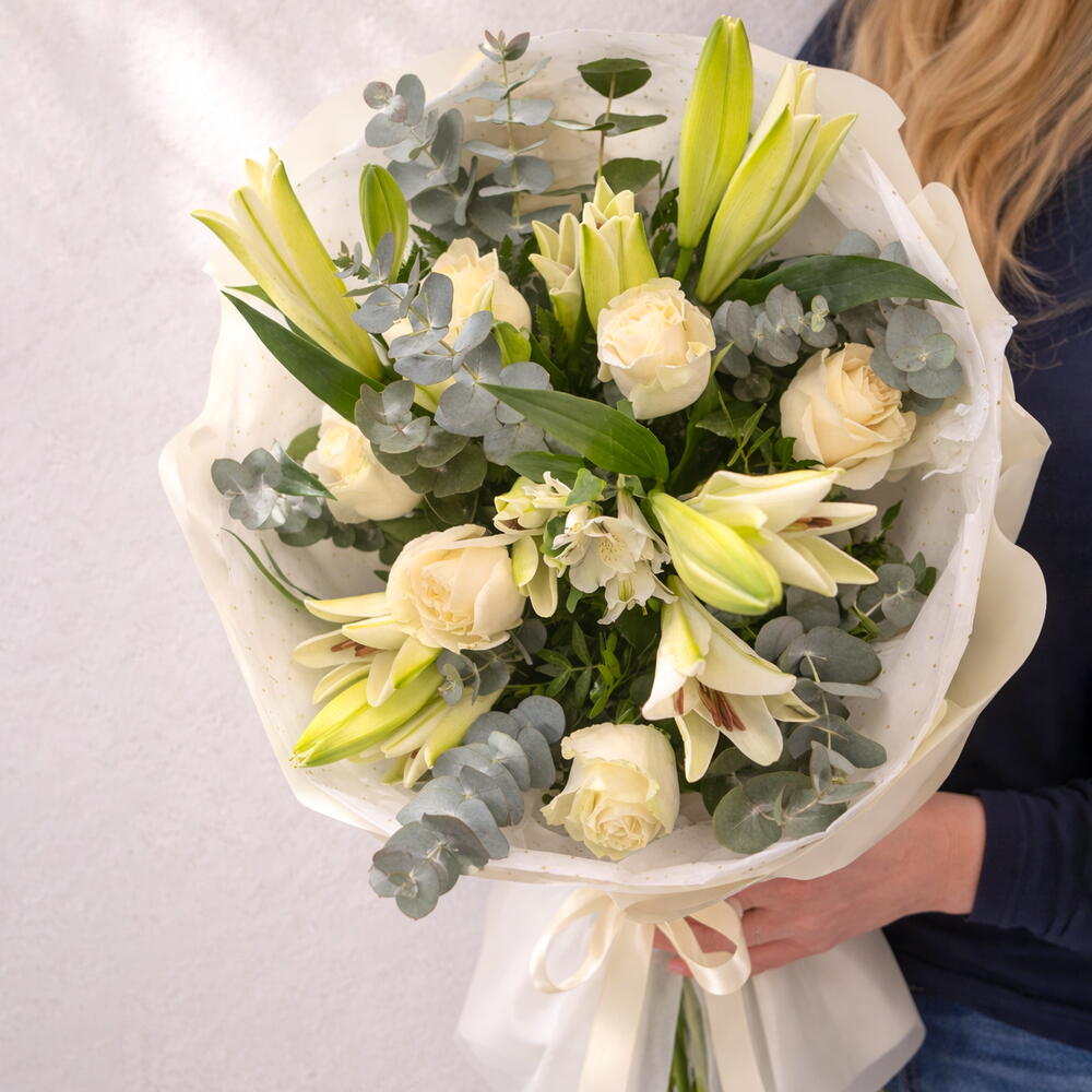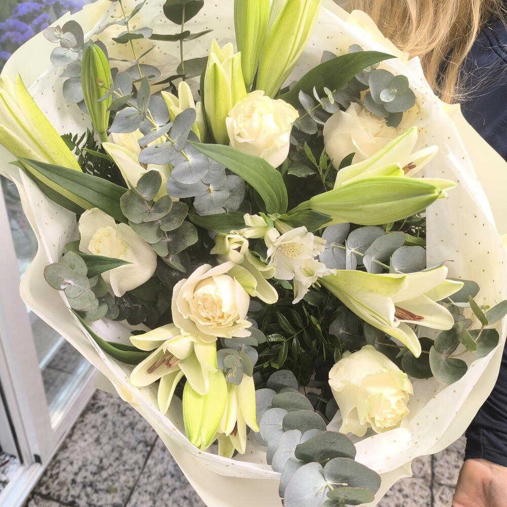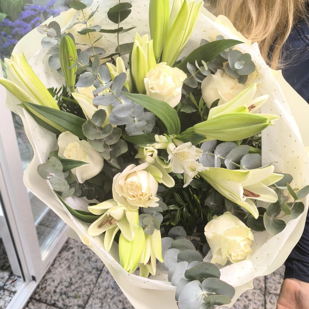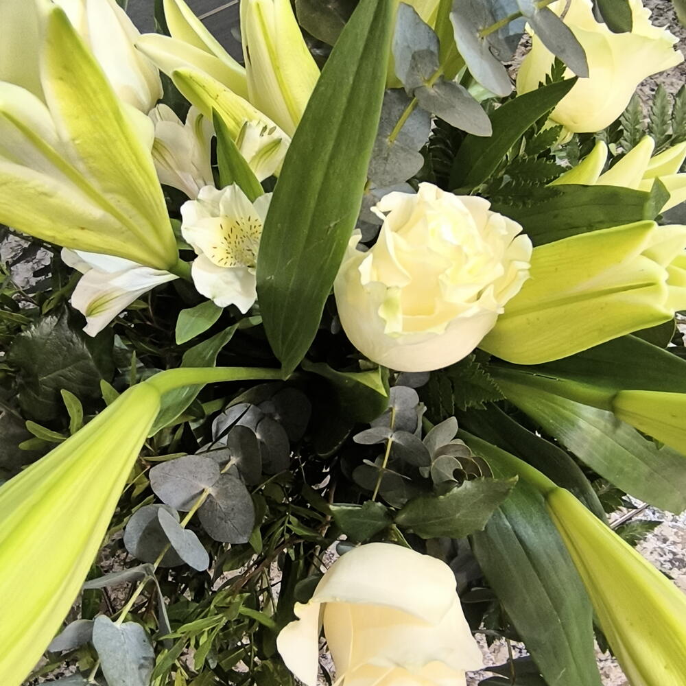 roses blanches - 6 pce lentisque - 7 pce lys blancs - 4 pce fougère en cuir - 7 pce