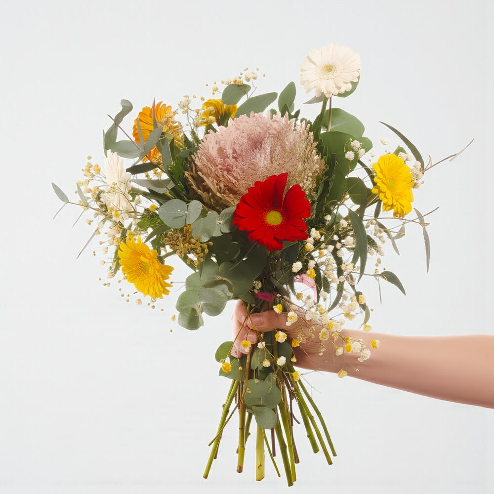 eucalyptus - 3 pce paniculata blanca - 2 pce Gérberas mixtes - 4 pce protéa naturel - 1 pce fleurs sauvages d'appoint - 2 pce