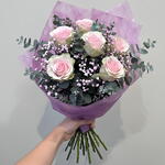 Bouquet délicat et très élégant, conçu dans une gamme harmonieuse de tons rose poudré et lilas doux. Les sept roses roses, aux pétales larges et à la forme parfaite, sont les protagonistes absolues et transmettent romantisme, tendresse et sophistication. La gypsophile, combinée dans des tons blancs et rosés, entoure les roses en créant un nuage léger et éthéré qui apporte du volume sans en réduire la délicatesse. L'eucalyptus à feuilles rondes ajoute un contraste moderne avec sa teinte vert grisâtre, apportant fraîcheur et équilibre visuel à l'ensemble. L'emballage lilas renforce le caractère romantique et raffiné du bouquet, en faisant une option idéale pour des cadeaux spéciaux, des anniversaires ou des moments qui méritent un détail élégant, féminin et plein de sensibilité.