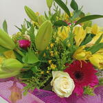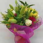 gypsophile - 3 pce rose blanche - 6 pce verdes variados - 4 pce Gérbera fuchsia - 4 pce lilum blanc - 4 pce alstroemère jaune - 5 pce