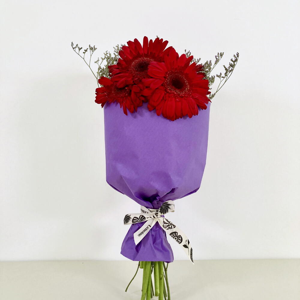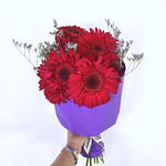 Couleurs à gogo ! C'est le nom de cette nouvelle collection de bouquets, parfaits pour offrir. Elle comprend sept gerberas rouges et une touche de limonium, le tout élégamment emballé dans un papier violet. La palette de couleurs, la composition et les fleurs sont parfaites.