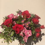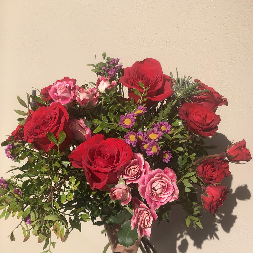 rose rouge - 5 pce rose rouge spray - 1 pce marguerite violette - 3 pce rose rose spray - 3 pce
