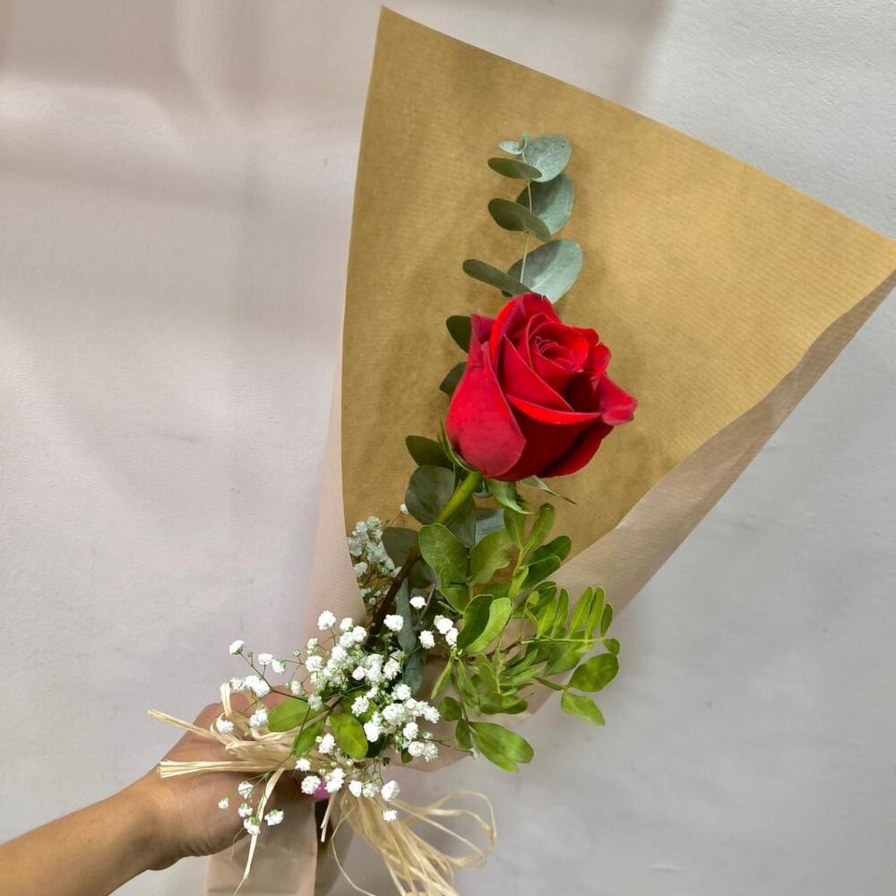 Une rose rouge présentée dans une délicate composition florale composée de gypsophile et de verdure naturelle, soigneusement emballée dans du papier kraft à la finition simple et élégante. Un cadeau intemporel pour exprimer votre amour, votre admiration ou votre gratitude en toute occasion. Parfait comme cadeau romantique, pour un anniversaire ou simplement pour surprendre avec un geste simple et significatif. Cette composition de roses naturelles est soigneusement préparée dans notre atelier, pour que votre message arrive toujours frais et spécial.