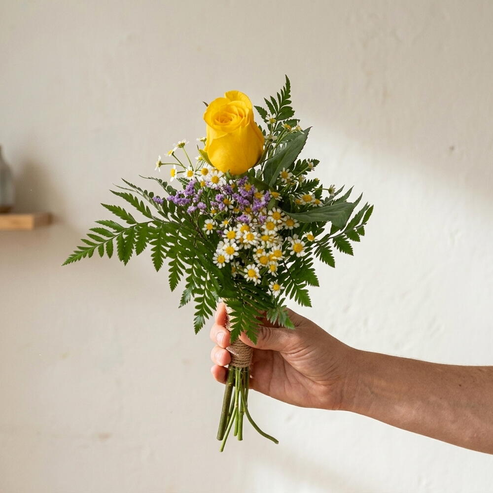 Bouquet délicat avec une lumineuse rose jaune comme protagoniste, accompagnée de petites fleurs de type camomille et de touches sauvages aux tons violets. La fougère apporte un air frais et naturel, créant une composition légère et harmonieuse. Ce bouquet transmet joie, proximité et chaleur, idéal pour un geste simple mais chargé de sens. Son style naturel le rend parfait pour ceux qui préfèrent des fleurs délicates et peu chargées. Parfait pour elle, pour une fille, pour une amie ou pour quelqu'un de spécial. Idéal comme cadeau, pour surprendre, pour remercier, pour un geste spontané ou pour égayer la journée. Une excellente option si vous cherchez un petit bouquet de fleurs, une rose jaune avec des fleurs sauvages, un bouquet naturel et délicat, des fleurs simples à offrir, un joli détail économique ou des fleurs avec livraison à domicile. 🌼✨
