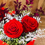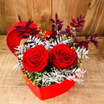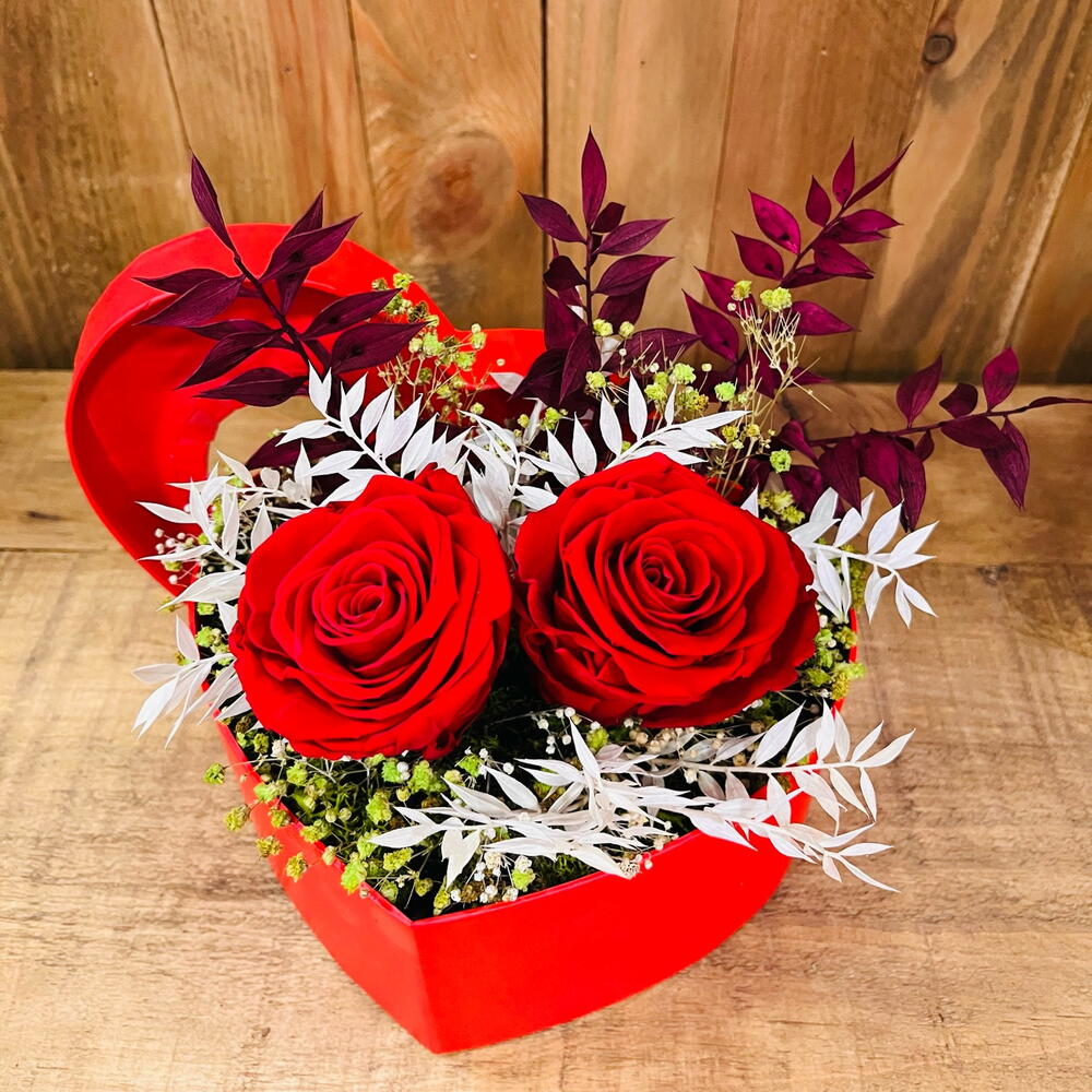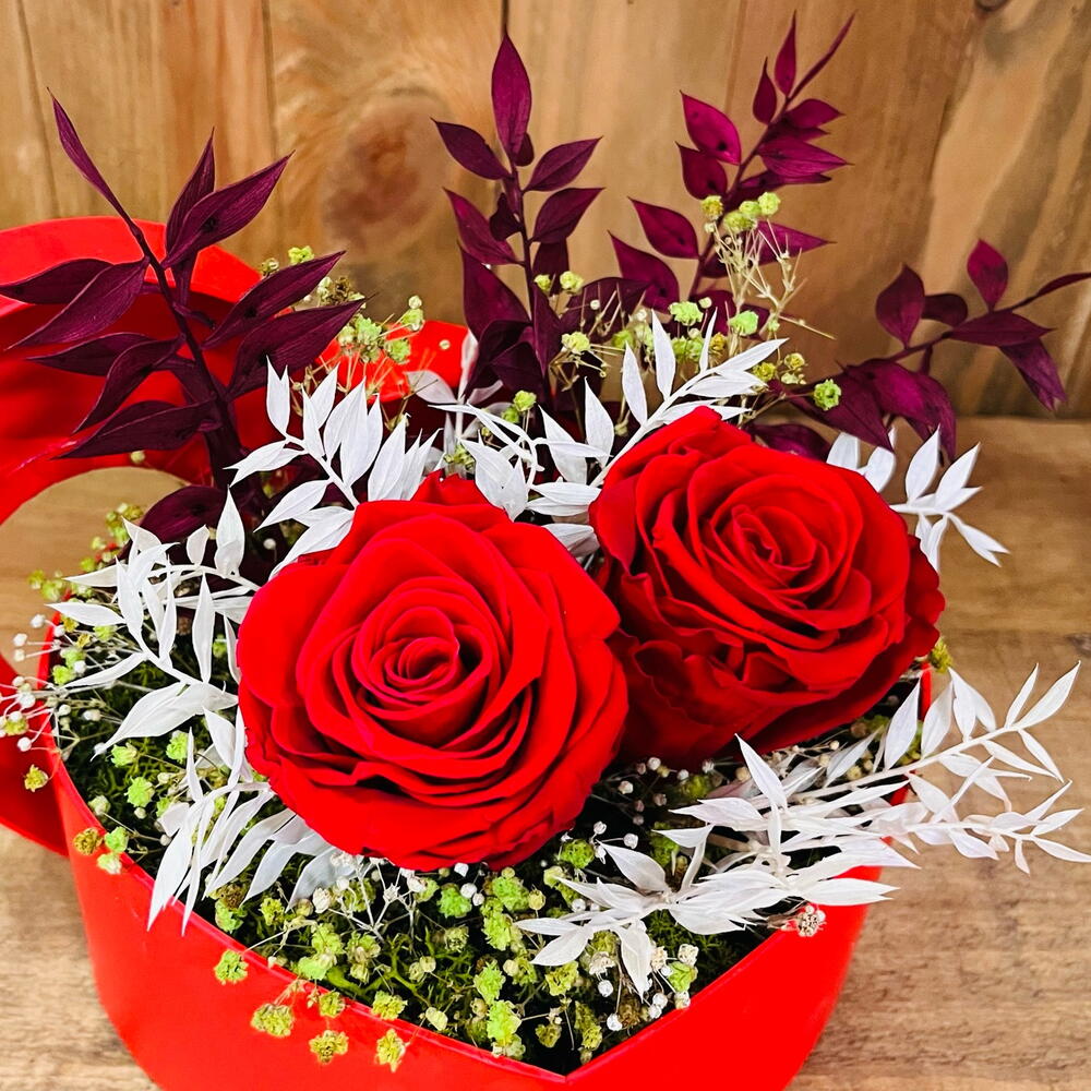 Boîte romantique avec des fleurs stabilisées, parfois des arrangements avec des fleurs stabilisées peuvent arriver à destination avec des fleurs d'une couleur ou d'une variété différente de celle de la photo, selon la disponibilité.