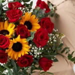 Élégant bouquet de fleurs avec des roses rouges freedom et des tournesols, idéal pour offrir à l'amour de votre vie 🌹❤️. Comprend l'emballage et le nœud.