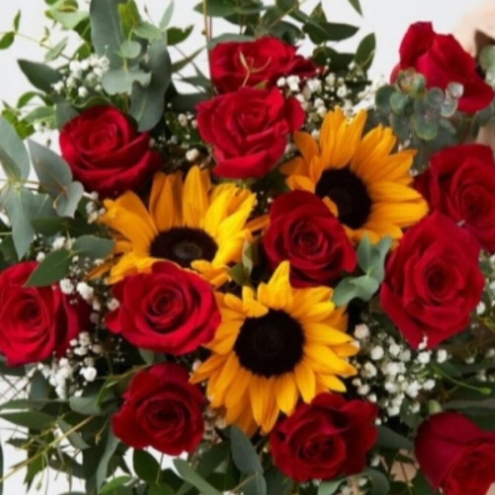 Rosas rojas y girasoles