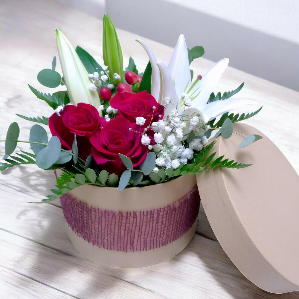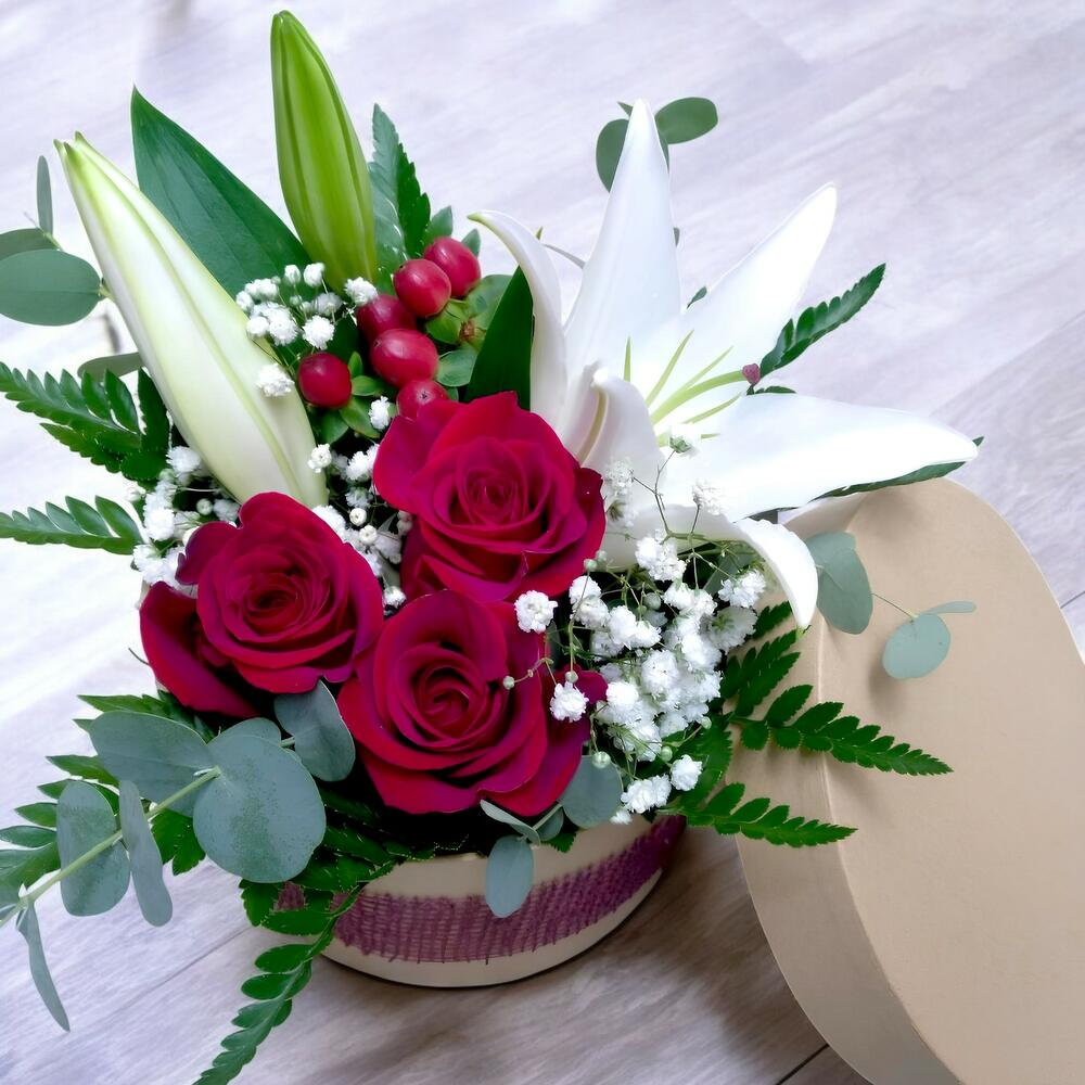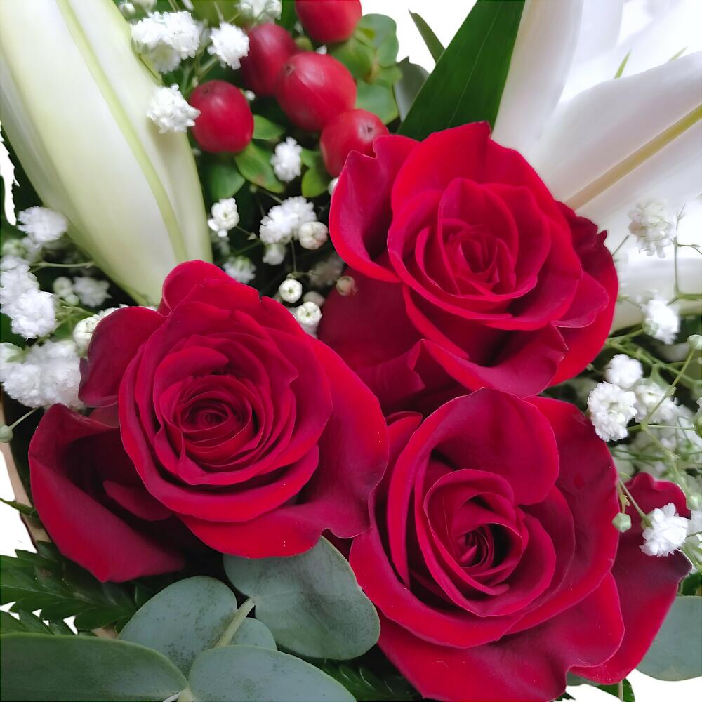 Gypsophila - 3 pce Lilium - 2 pce eucalyptus - 3 pce rosas - 3 pce helecho - 3 pce hypericum rouge - 1 pce