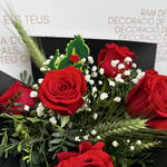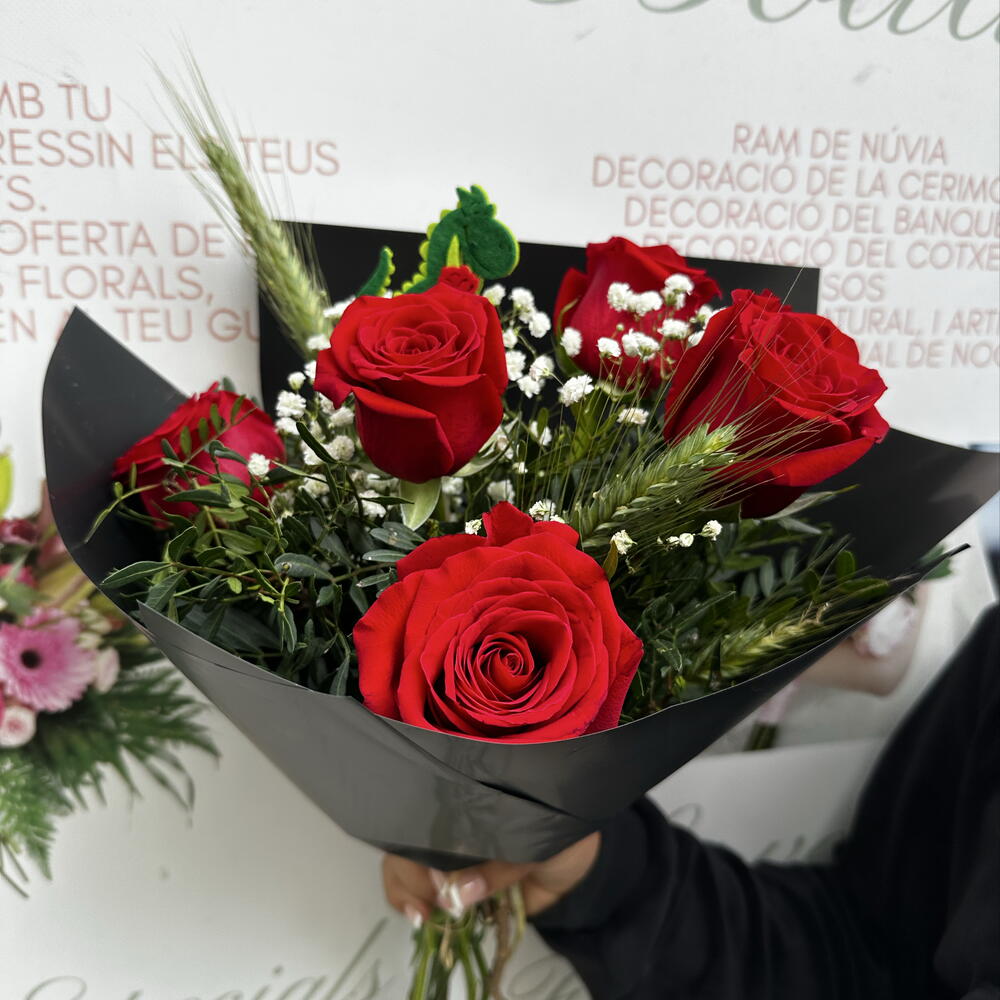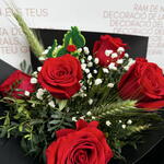 Cette ravissante composition florale signature met en scène cinq magnifiques roses, symboles de romantisme, et trois brins de blé qui apportent une touche de fraîcheur et d'originalité. Trois feuillages variés viennent compléter cet élégant arrangement, lui conférant volume et profondeur, tandis que deux jolies tiges de gypsophile lui apportent une douceur incomparable. Un arrangement idéal pour la Saint-Joseph.