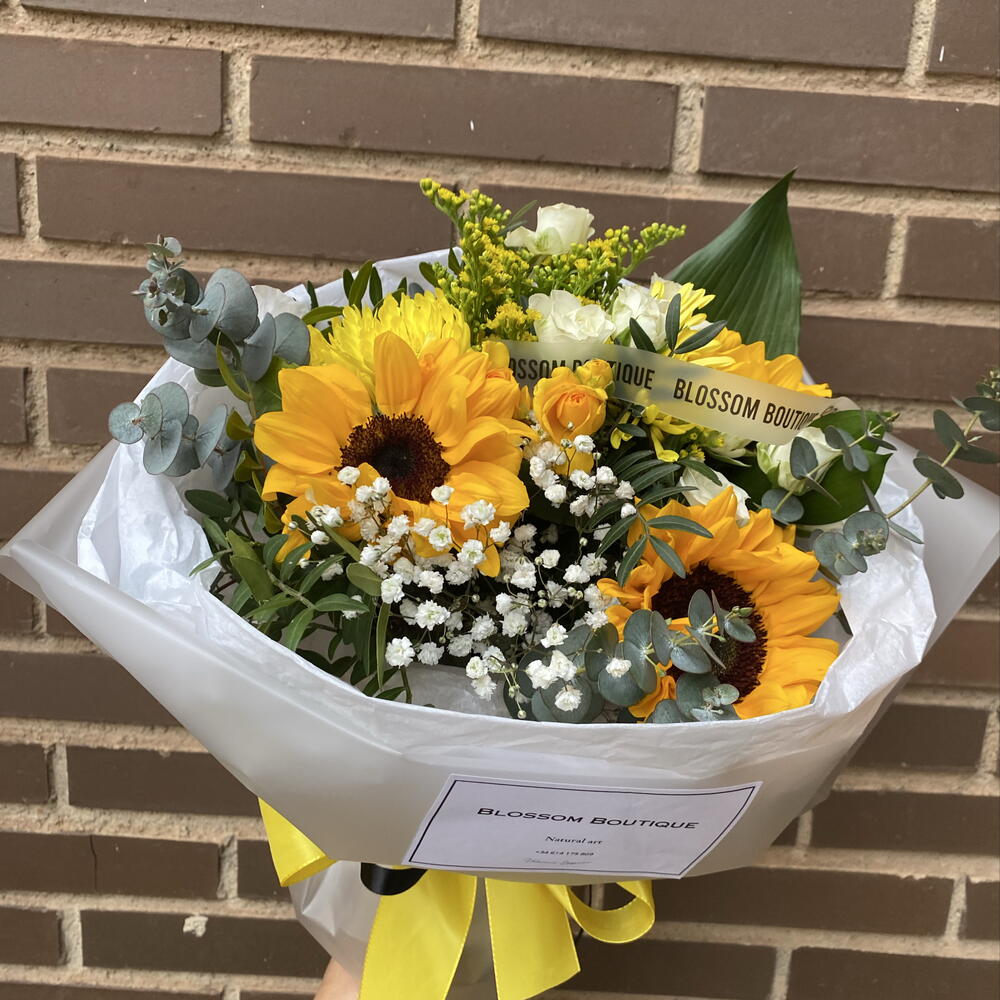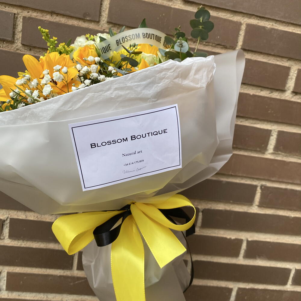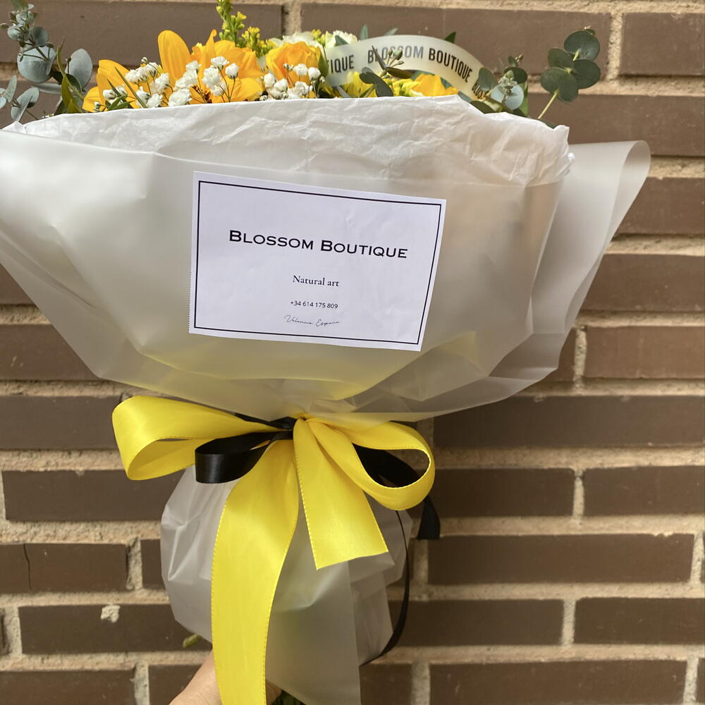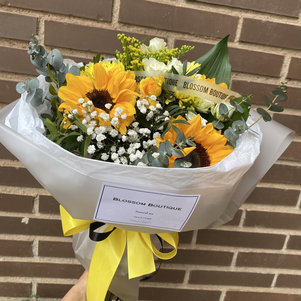 La tradition du 21 mars n'a jamais paru aussi sophistiquée ! Ce bouquet est le détail parfait pour célébrer l'arrivée du printemps. Nous avons combiné trois tournesols moyens comme protagonistes, accompagnés d'une triade de vibrants chrysanthèmes jaunes pour un volume spectaculaire. La délicatesse est apportée par trois roses spray aux tons blancs et jaunes qui s'entrelacent avec une nuée de gypsophile blanche. La touche finale et fraîche est donnée par des branches d'eucalyptus, le tout présenté dans un élégant emballage en papier mat avec notre sceau de qualité et un ruban satiné jaune. Offrez la joie du soleil dans un bouquet inoubliable.