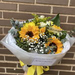 paniculata - 2 pce lentisque - 3 pce carte pour message - 1 pce eucalyptus - 3 pce chrysanthème jaune - 3 pce tournesols moyens - 3 pce papier de soie blanc - 2 pce roses spray blanches et jaunes - 3 pce papier floral blanc translucide - 2 pce rubans jaunes et noirs - 2 pce