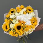 hortensia - 1 pce tanacetum - 5 pce tournesols - 5 pce rose blanche en spray - 2 pce rose spray jaune - 6 pce
