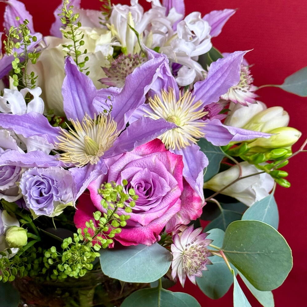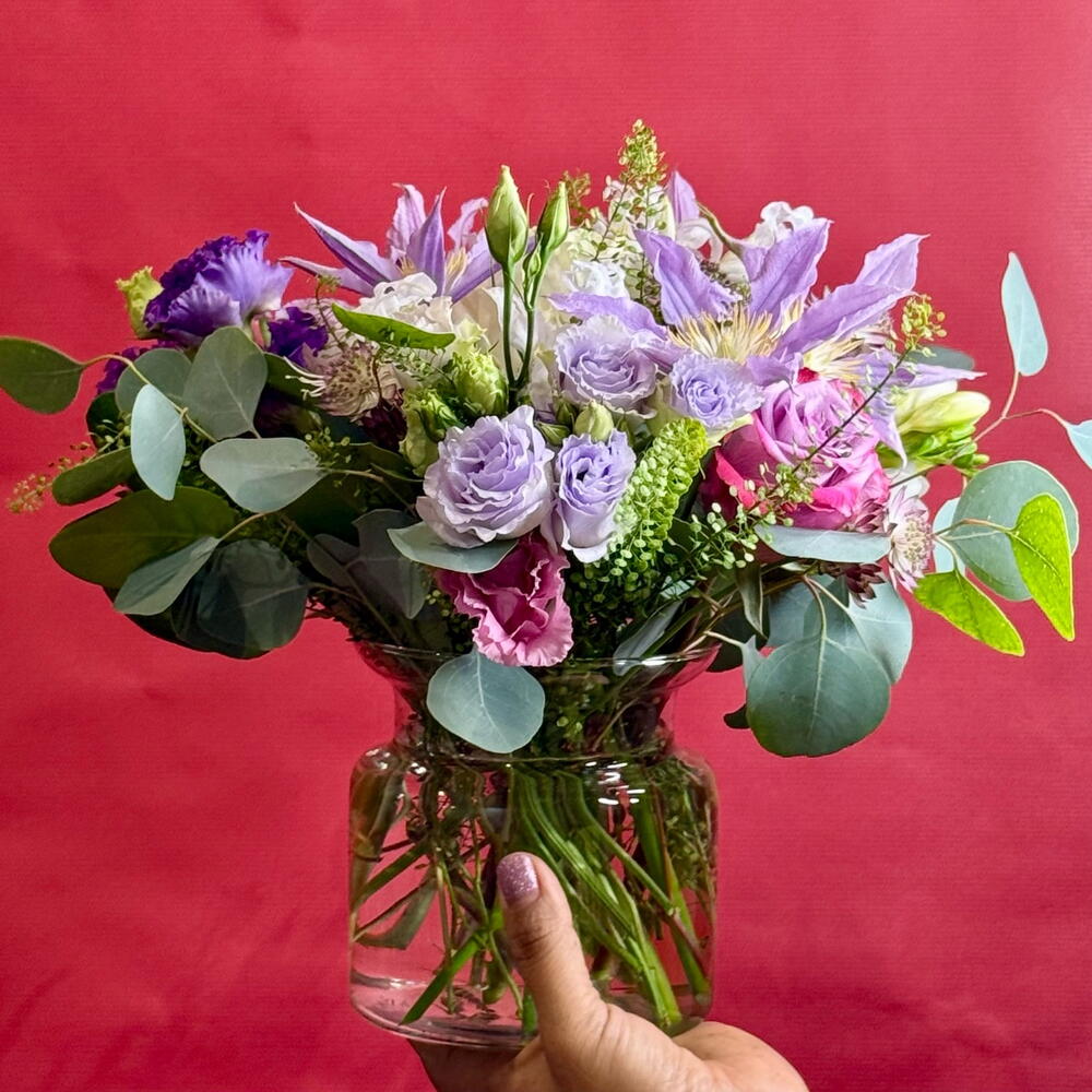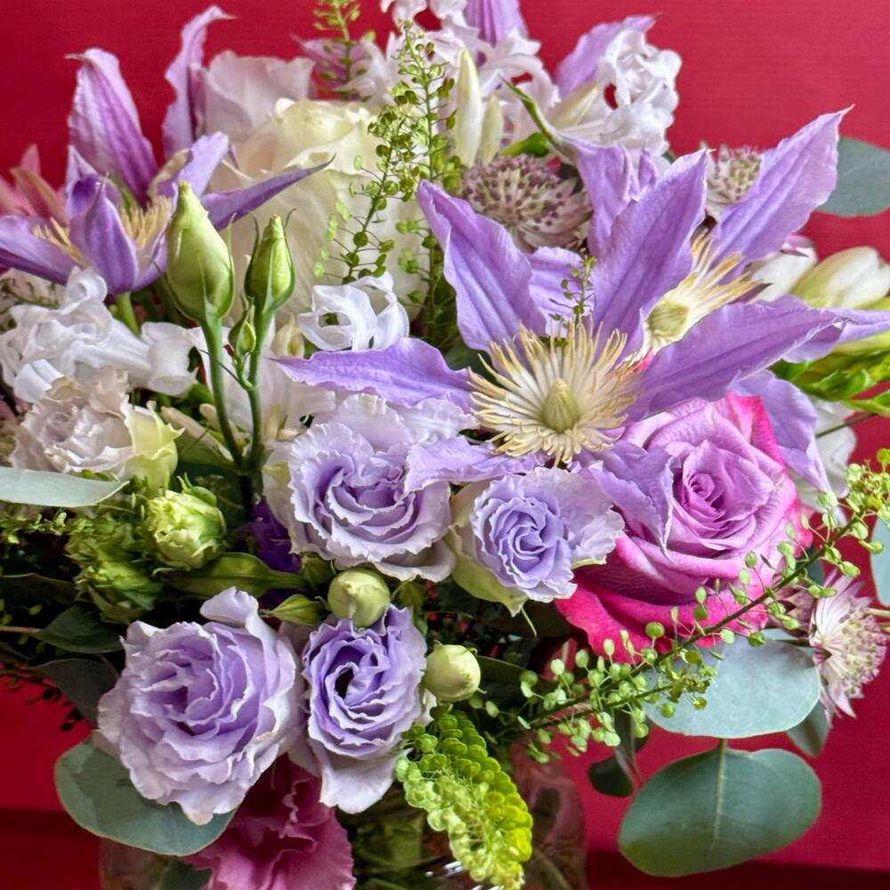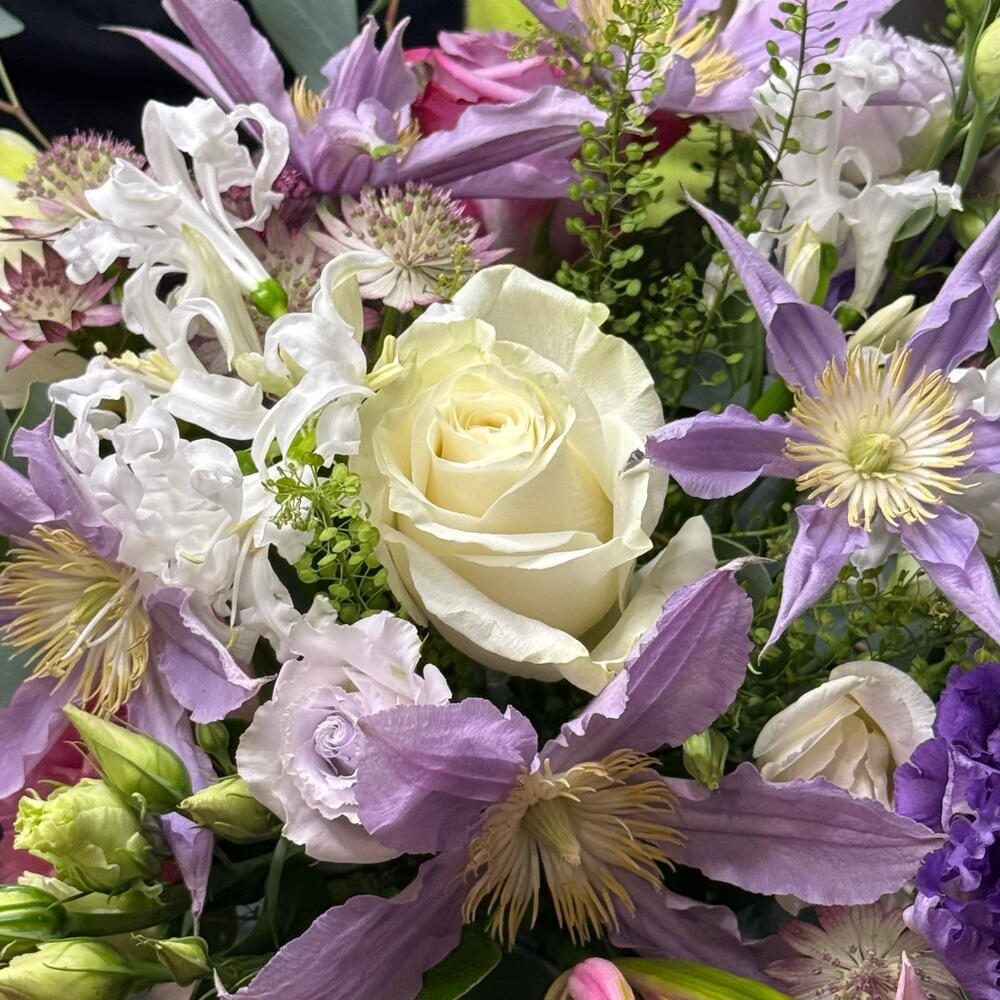 Cette exquise composition florale signature est composée d'une élégante sélection de fleurs vibrantes et délicates. Elle comprend 5 clématites pour une touche de mystère, 3 lisianthus pour une touche de douceur, 1 rose lavande et 1 rose blanche pour une touche classique et romantique, 1 freesia pour une explosion de couleurs, 3 nérines pour plus de profondeur et de beauté, 2 astrantias et 2 thlaspis pour une texture unique, le tout associé à 2 verdures de saison pour une touche finale fraîche et vibrante. Cette composition est livrée avec un petit vase en verre, offrant la base idéale pour mettre en valeur la beauté naturelle de ces fleurs. Cette combinaison florale sera idéale en toute occasion, attirera tous les regards et sublimera n'importe quel espace. Veuillez noter que, bien que nous mettions tout en œuvre pour nous procurer les ingrédients exacts, il peut arriver que nos fleuristes soient amenés à les remplacer par une tige similaire. Chaque bouquet Qantu Quality Flowers est conçu et fabriqué à la main dans notre atelier avec les plus belles fleurs provenant de producteurs et fournisseurs de confiance. Si vous souhaitez une autre couleur, n'hésitez pas à nous contacter.