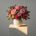 Bouquet rose moyen, avec des œillets, des chrysanthèmes et diverses fleurs roses.
