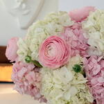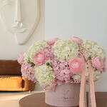 white hydrangea - 3 pce pink hydrangea - 2 pce boîte à chapeau - 1 pce renoncule rose - 5 pce