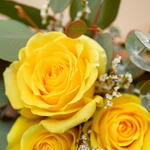eucalyptus - 4 pce roses jaunes - 3 pce statice - 4 pce emballage en jute - 1 pce étiquette avec message personnalisé gravé au laser - 1 pce