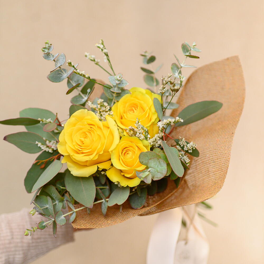 Ce bouquet classique et élégant comprend 4 feuilles d'eucalyptus, 3 roses jaunes et 4 statices, enveloppées méticuleusement dans un emballage en jute. De plus, chaque bouquet est livré avec une étiquette personnalisée gravée au laser, sur laquelle vous pouvez laisser votre propre message. Ce bouquet est parfait pour ajouter une touche de distinction et de beauté naturelle à n'importe quel recoin de votre maison.