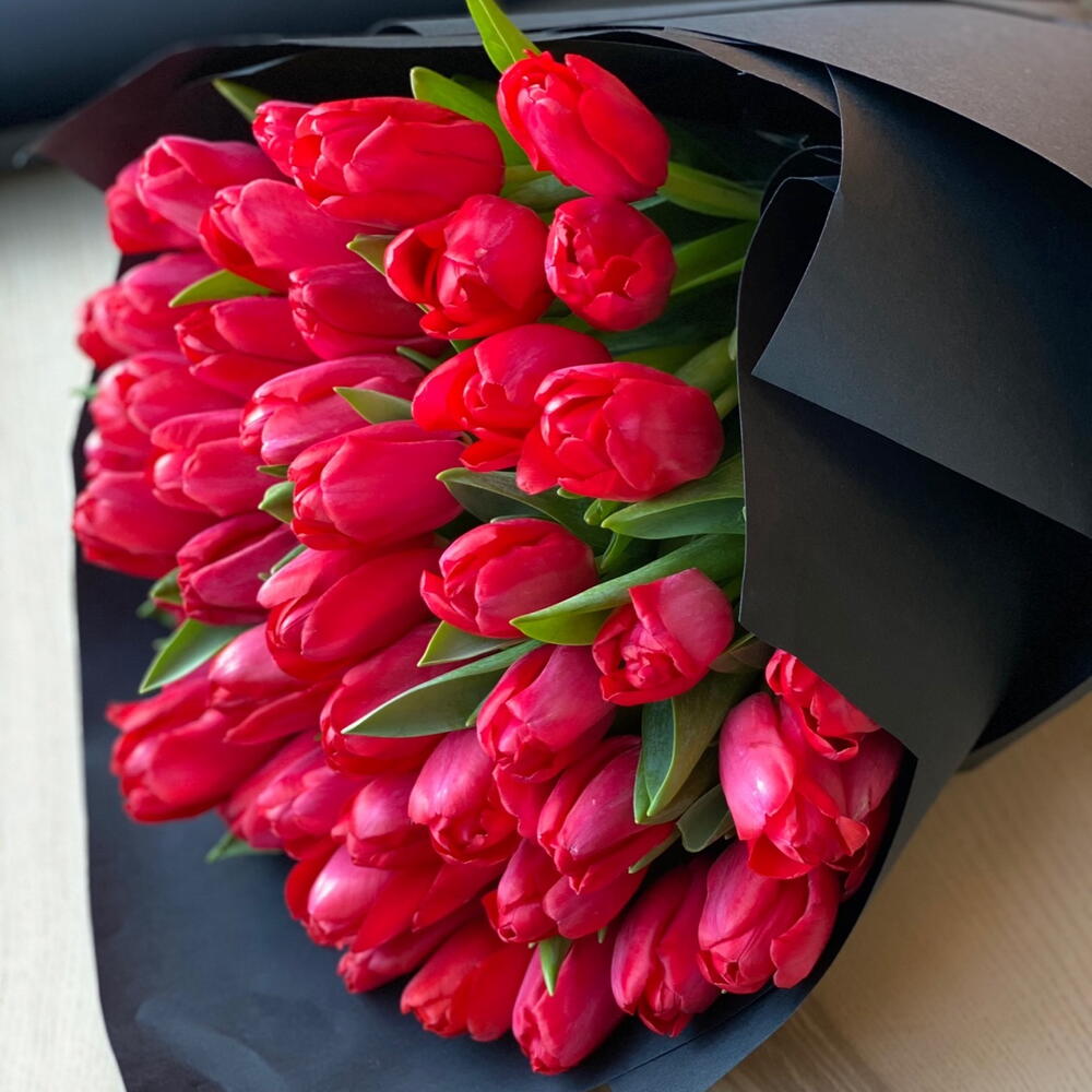 Two Lips Kiss: La Ruée Écarlate Enflammez les sens avec notre Two Lips Kiss, un chef-d'œuvre monochrome époustouflant composé de 55 tulipes rouges de qualité supérieure. Contrairement aux bouquets standards, cet arrangement Grande mise sur une couleur pure et saturée et un volume architectural, créant un nuage vibrant de passion saisonnière. Chaque tige est sélectionnée à la main pour sa robustesse et sa teinte vive, garantissant une présentation dense et d'un fort impact qui évolue magnifiquement dans le vase. Pour contraster l'intensité rouge des fleurs, nous les avons enveloppées dans un habillage noir de minuit, tranchant et sculptural, conférant à ce classique de jardin une touche moderne et haute couture. • Les Fleurs : 55 tulipes rouges de qualité Grade A pour une densité visuelle inégalée. • La Silhouette : Un dôme massif, lié à la main, conçu pour se distinguer comme une déclaration audacieuse pour l'intérieur. • La Présentation : Emballage signature noir mat avec une finition artisanale professionnelle.