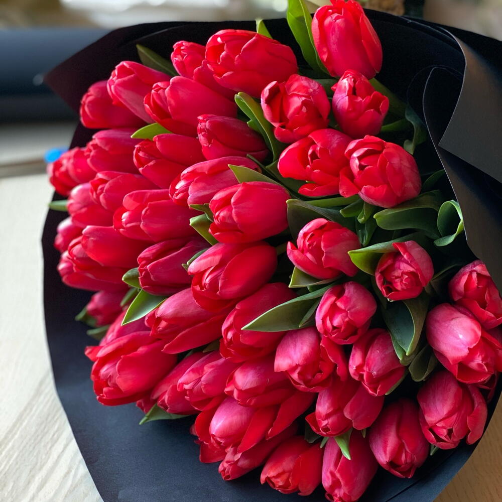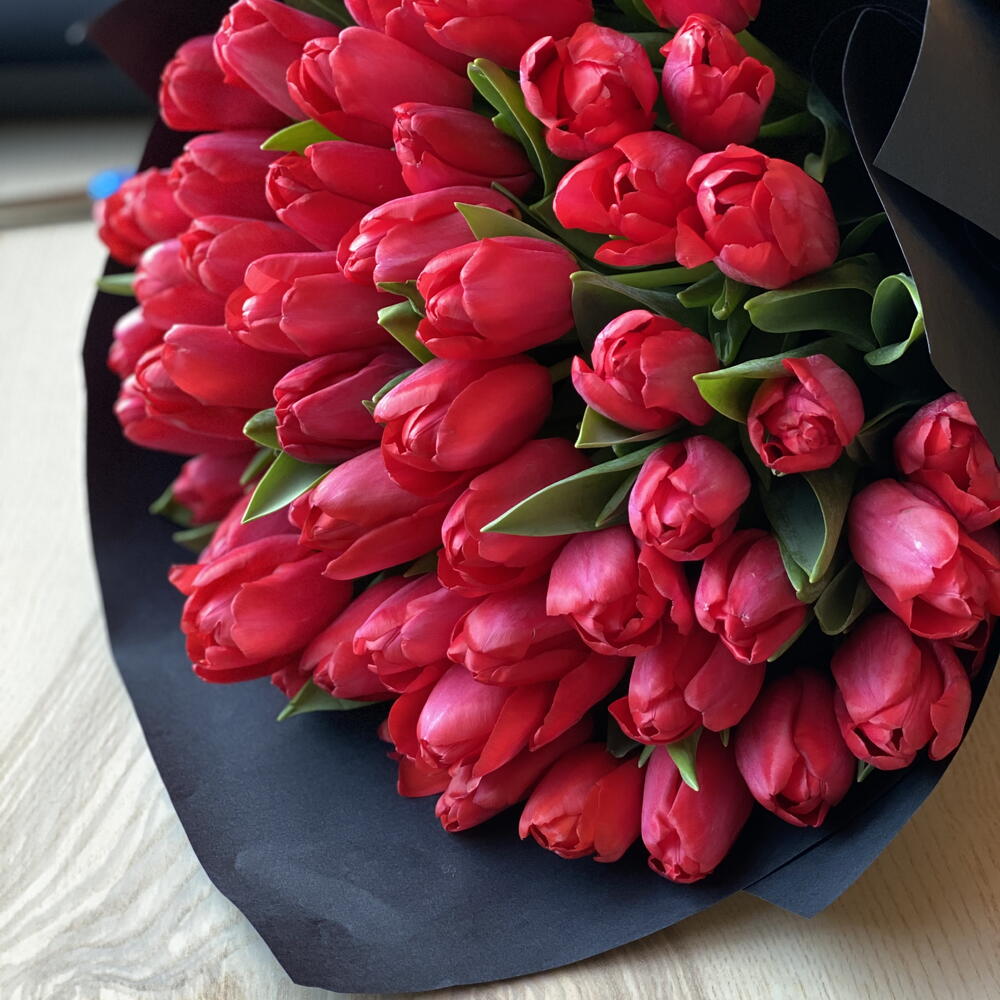 Le baiser de deux lèvres - bouquet de tulipes 55 tulipes rouges