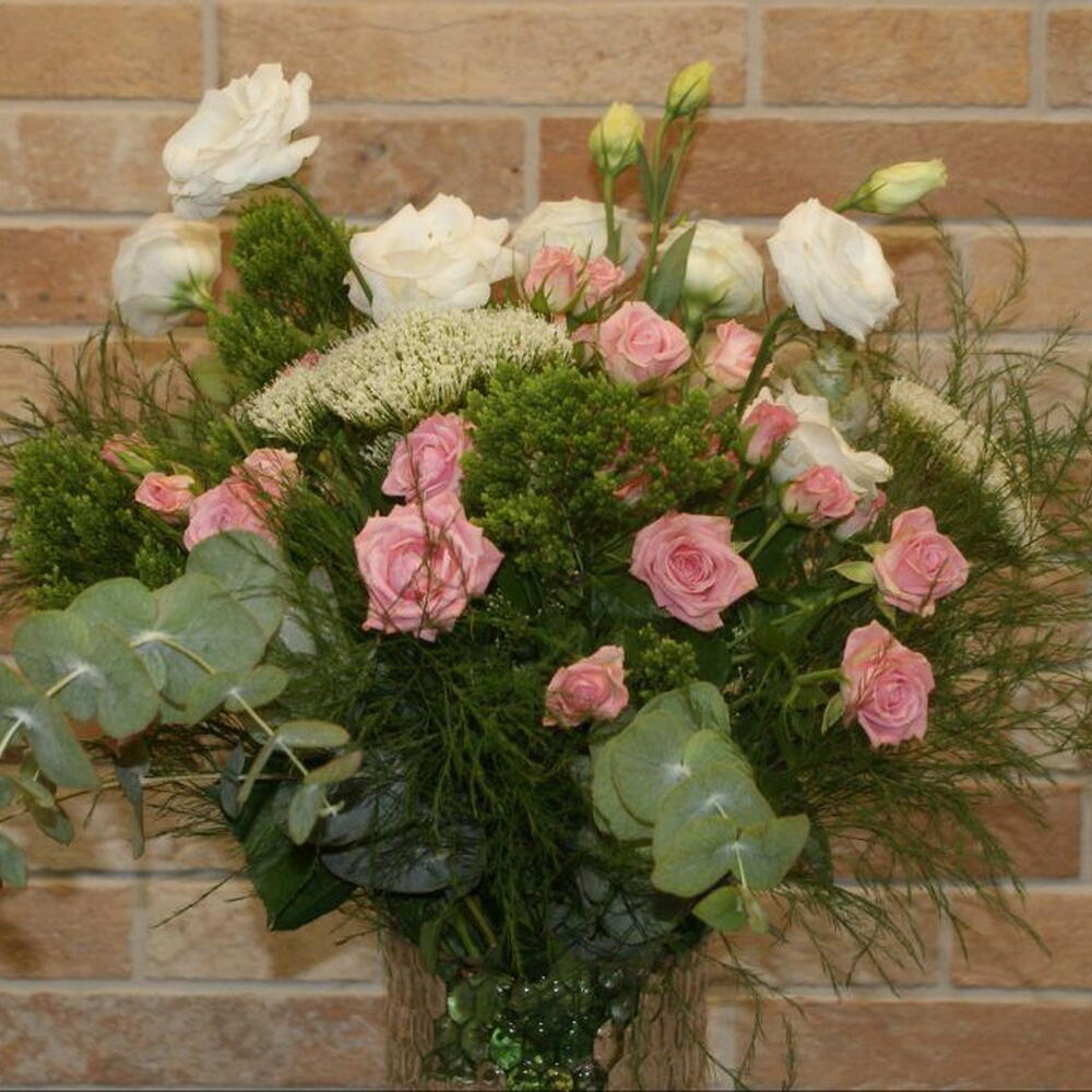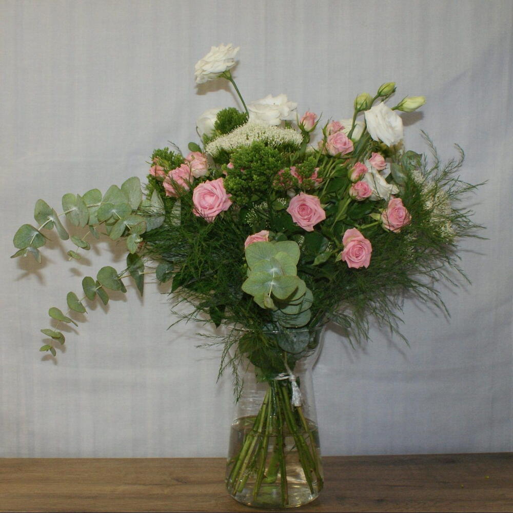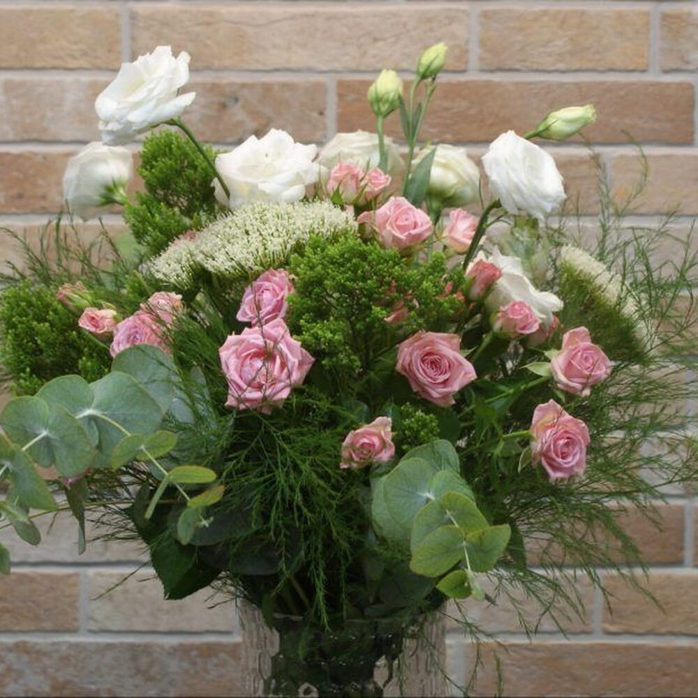 eucalyptus - 3 pce lisianthus blanc - 3 pce roses spray roses - 6 pce asperge verte décorative - 4 pce
