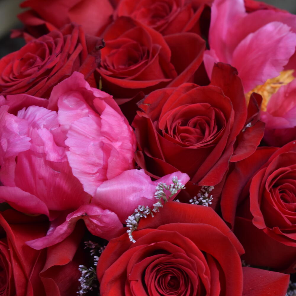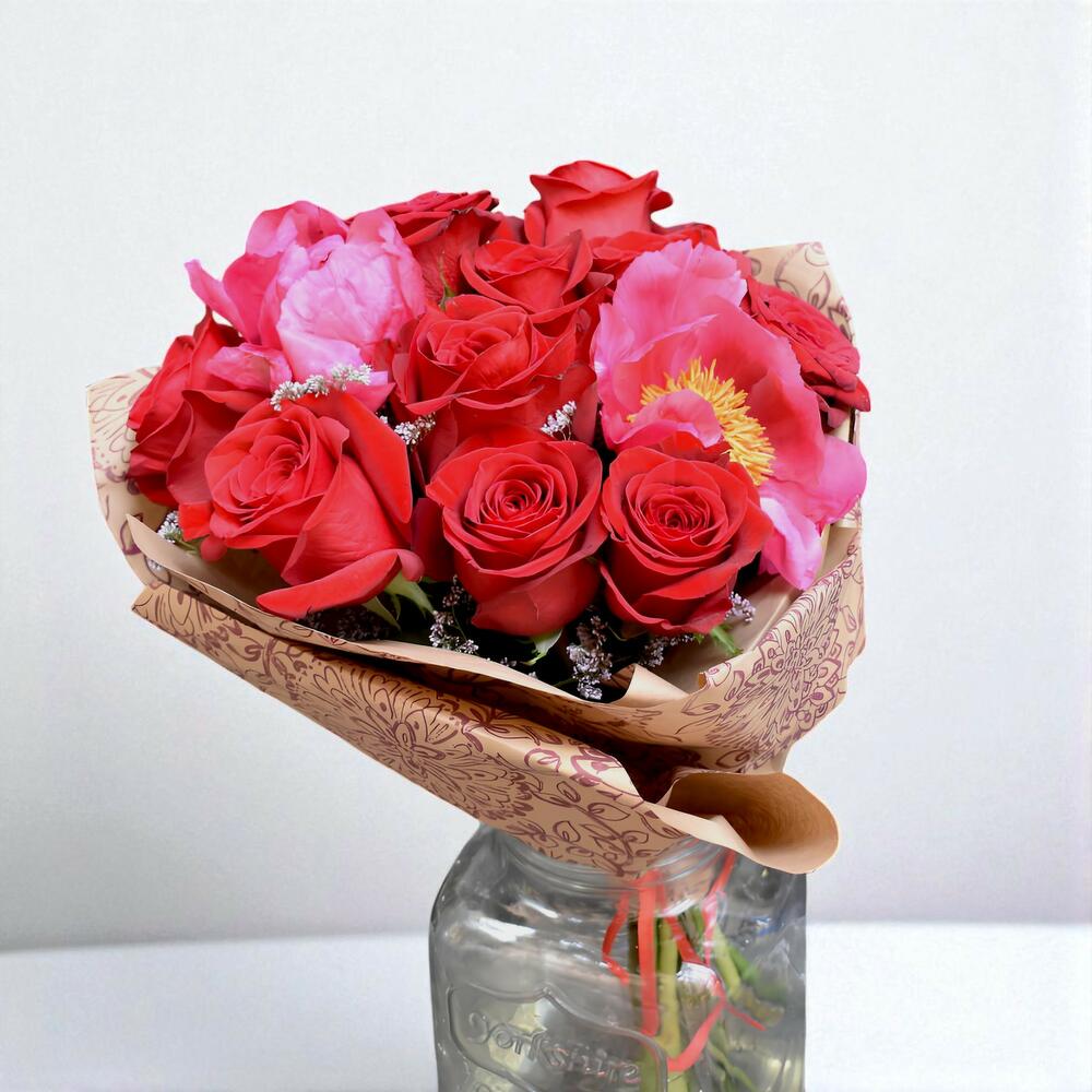 Le rouge, c'est l'amour. Les pivoines… l'amour au carré. Ce bouquet est pure passion et plaisir. Les roses rouges et les pivoines entièrement ouvertes éclatent en tons framboise intenses, comme une explosion d'émotion et de désir. Chaque fleur vibre d'énergie, comme si ses pétales parlaient la langue de l'amour ardent. Offrez une chanson faite de fleurs. Une mélodie qui parle d'amour, de moments inoubliables et du feu doux qui brûle sur les terrasses d'été à Barcelone. Idéal pour conquérir, célébrer un amour profond ou simplement dire “je te choisis”, avec toute l'intensité du rouge.