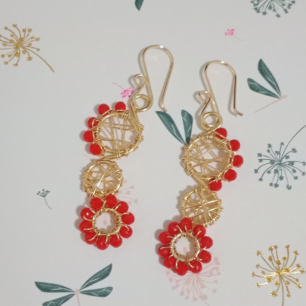 Le tissage d'attrape-rêves est souvent très courant dans les pièces de travail du fil. Cette pièce est unique et comporte deux circonférences avec un tissage d'attrape-rêves pour lui donner de la structure. La base présente une série de petits ronds rouges qui simulent les pétales d'une rose.