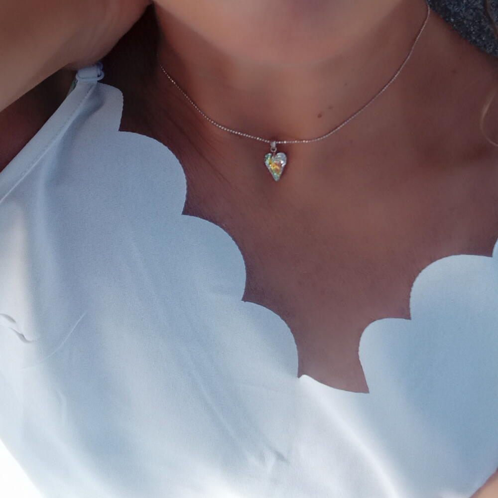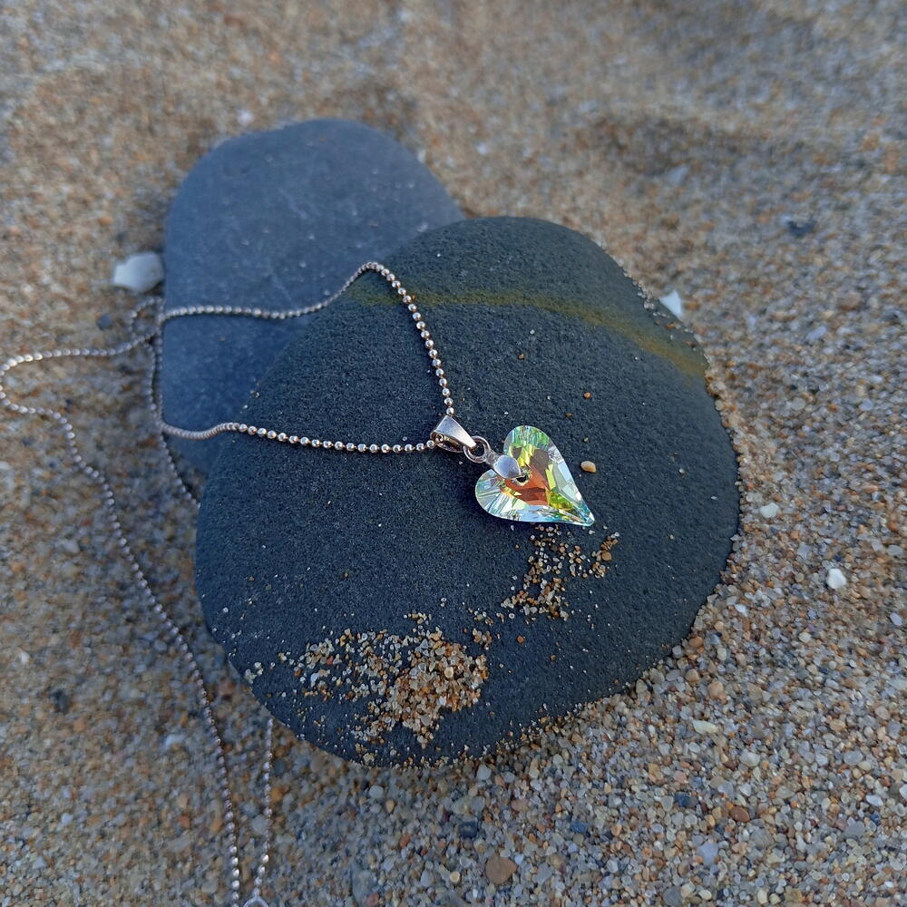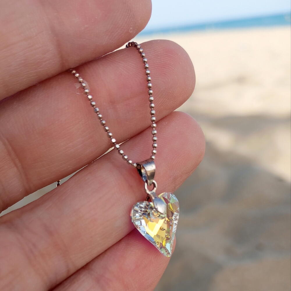 Élégant collier en argent sterling avec un pendentif en forme de cœur allongé en cristal tchèque de haute qualité. Comme vous pouvez le voir sur les photos, il s'agit d'un cristal transparent appelé « Aurore Boréale », qui reflète différentes nuances de lumière. Il se fond parfaitement dans l'environnement ! Idéal pour offrir et surprendre quelqu'un avec un bijou délicat, ce magnifique cristal, par sa touche de lumière unique, illumine et apporte harmonie, équilibre et énergie positive ! Les dimensions indiquées dans les Dimensions de l'article sont approximatives ; la mesure exacte est de 1 cm de large x 1,40 cm de long. La chaîne est en argent sterling taille diamant et mesure 40 cm de long. Si vous souhaitez une longueur différente de celle indiquée, veuillez l'indiquer dans la section Commentaires de votre commande. Vous pouvez également nous envoyer un message ! Nous serons ravis de vous aider.