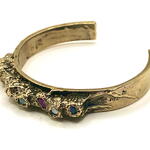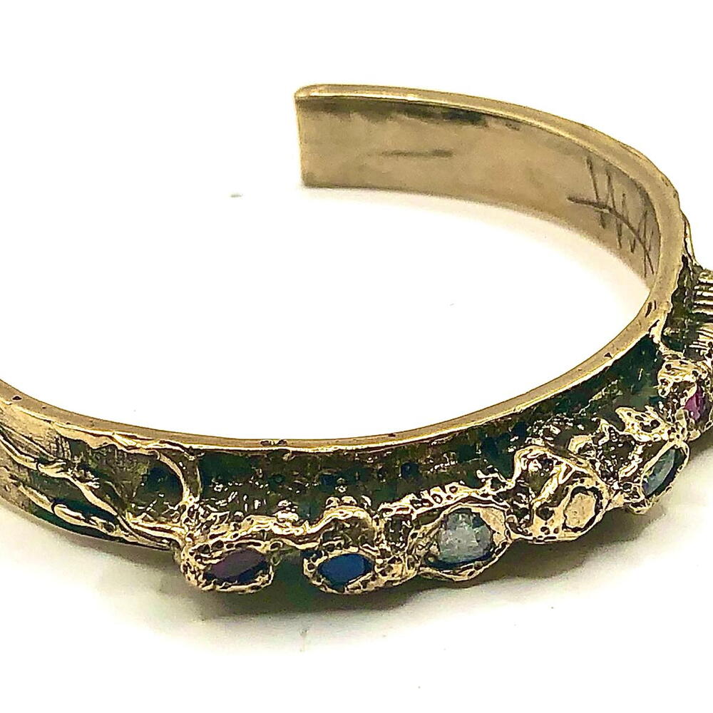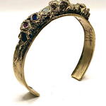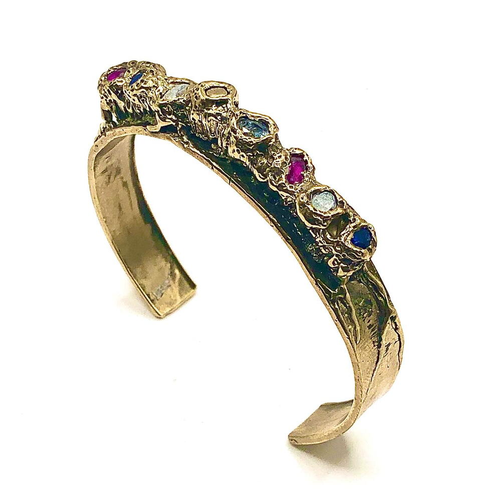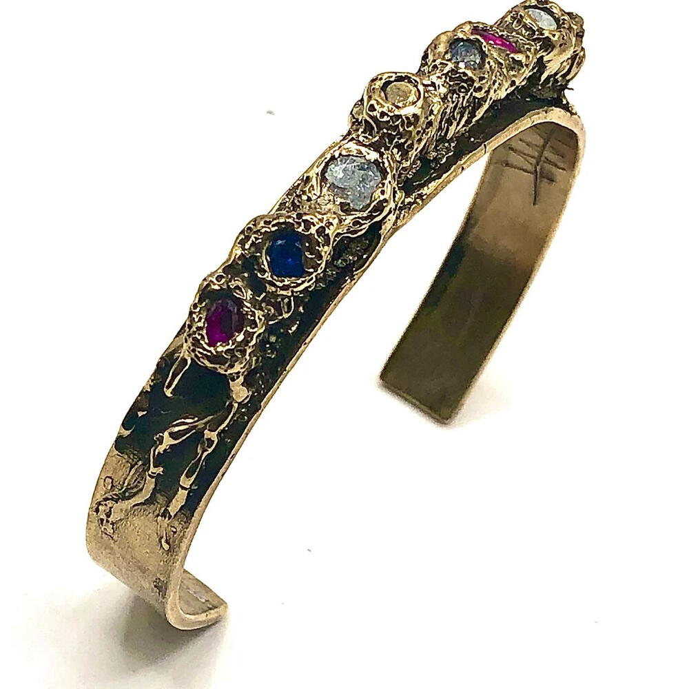 Bracelet Couleurs de Gaudí : Un hommage au génie moderniste Ce bracelet jonc ouvert est une pièce unique et évocatrice, baptisée Couleurs de Gaudí en hommage au célèbre architecte catalan Antoni Gaudí. Son design minutieusement réalisé capture l'essence du modernisme barcelonais, fusionnant des formes organiques et une palette de couleurs vibrantes. Caractéristiques : Matériau : Le bracelet est coulé en bronze, un métal qui évoque la chaleur et la tradition artisanale. La finition texturée du bronze accentue le relief des formes et lui confère une allure antique et noble. Design : La partie centrale du bracelet présente un design sculptural et asymétrique, composé de formes organiques et fluides rappelant l'architecture de Gaudí. Ces formes sont sublimées par une variété de pierres synthétiques aux couleurs intenses et éclatantes, telles que le bleu cobalt, le vert émeraude, le rouge rubis et le transparent. Les pierres précieuses sont serties de manière irrégulière, créant un effet dynamique et vibrant, à l'image des mosaïques trencadís caractéristiques de l'œuvre de Gaudí. Détails : L'intérieur du bracelet est gravé de la signature de l'artiste et de l'inscription « ARTISTIC FOUNDRY BRONZE and SYNTHETIC GEMS », certifiant son authenticité et les matériaux utilisés. De plus, le bord du bracelet est orné de motifs inspirés du design moderniste. Style : Ce bracelet est une pièce forte qui ne passera pas inaperçue. Son design unique et ses couleurs éclatantes en font le bijou idéal pour les occasions spéciales ou pour apporter une touche de sophistication et d'originalité à toutes vos tenues. Signification : Le bracelet Gaudí Colors est bien plus qu'un simple accessoire ; c'est un hommage au génie de Gaudí et à la beauté du modernisme. Son design évoque la magie et la créativité de Barcelone, et ses couleurs vibrantes vous invitent à célébrer la vie et la joie de vivre. En bref : Le bracelet Gaudí Colors est un bijou artisanal unique et chargé de sens. Son design sculptural, ses couleurs éclatantes et ses détails méticuleux en font une œuvre d'art qui rend hommage à l'un des plus grands architectes de l'histoire.