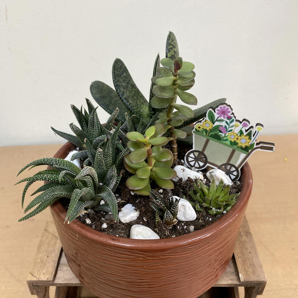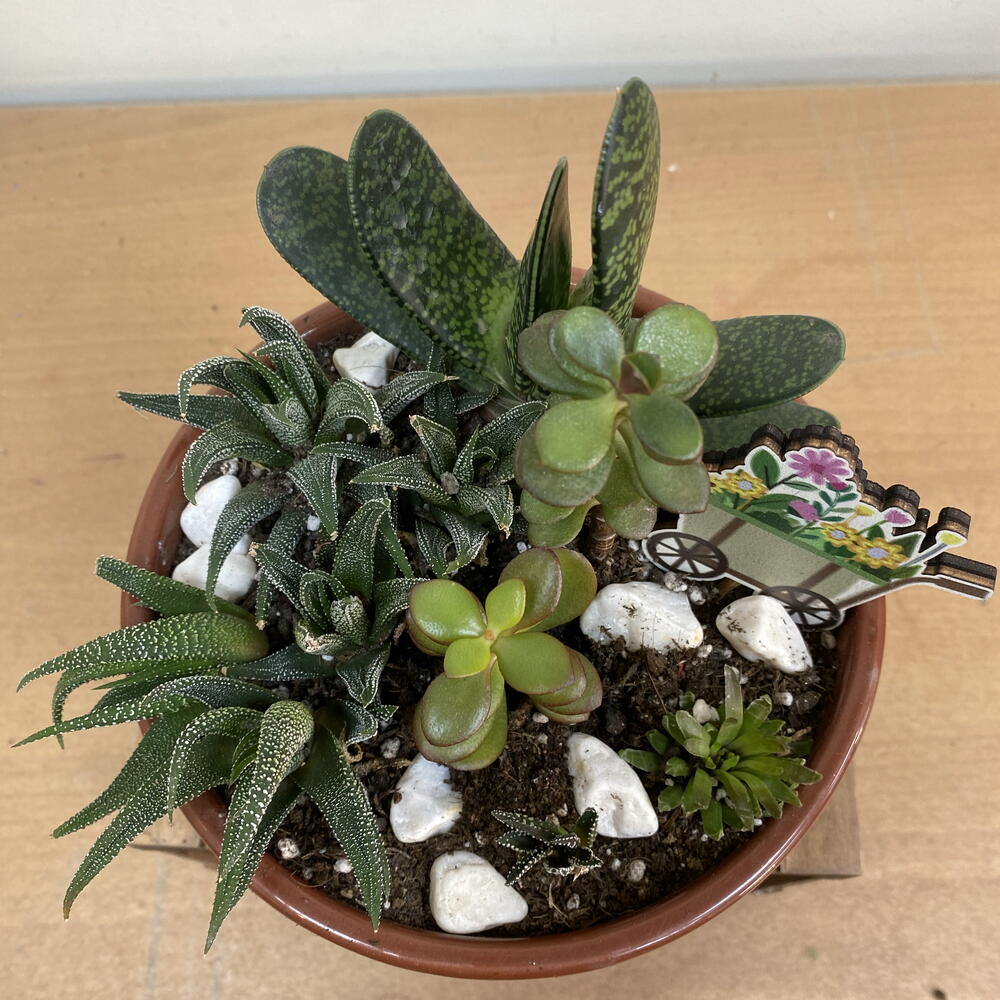 Composition de cactus variés, sur une base en céramique avec pic décoratif et pierres