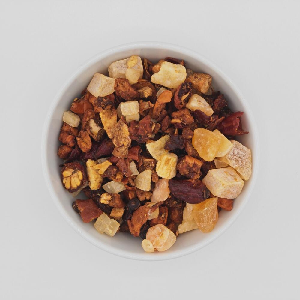 Cette infusion est une délicieuse combinaison de saveurs sucrées et tropicales qui vous transportera dans un paradis exotique à chaque gorgée. Cette boisson est idéale à déguster à tout moment de la journée, que ce soit en remplacement d'un dessert sain ou pour se rafraîchir en lisant le soir. Essayez cette exquise combinaison de saveurs et savourez un paradis tropical dans votre tasse. Ingrédients : Morceaux de poire (25 %), morceaux de pomme (pomme, acidulant : acide citrique), morceaux d'ananas confits (ananas, sucre), morceaux de mangue confits (mangue, sucre), morceaux de melon Galia, écorces d'églantier, arôme naturel, morceaux de kiwi (1,5 %) 10 min 100 °C 4 g/200 ml