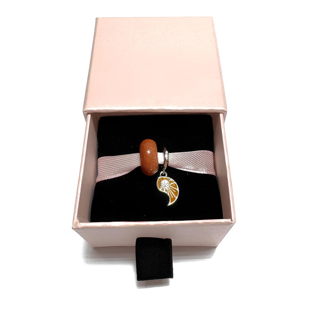 Elegante charm con piedra en tono ámbar brillante y colgante en forma de ala dorada con detalles luminosos. Su diseño simboliza libertad, energía y esperanza, perfecto para quienes buscan llevar siempre un toque cálido y positivo. Ideal para complementar tu pulsera o regalar un detalle con significado. 🌅