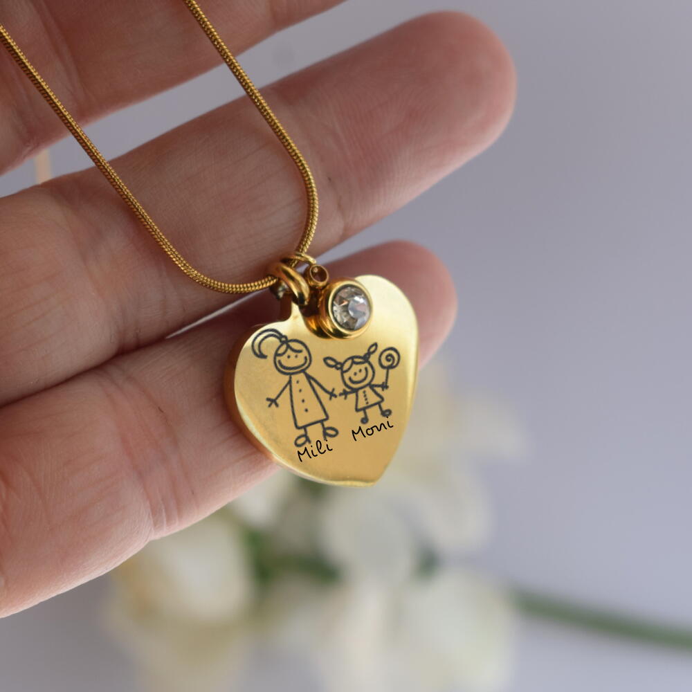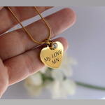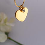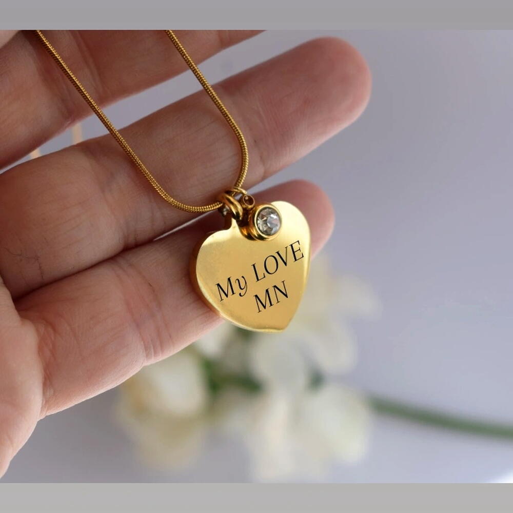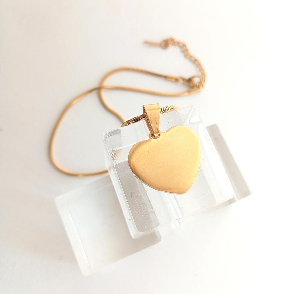 Hermoso Colgante Corazón Personalizable. Con elegante Cadena también confeccionada en Acero inoxidable con Oro. Podemos grabar en el Corazón, frases, nombres, con tu letra o con fuentes True Type. También podemos grabar un dibujo, fotos lo que tú elijas!