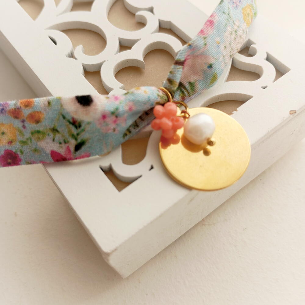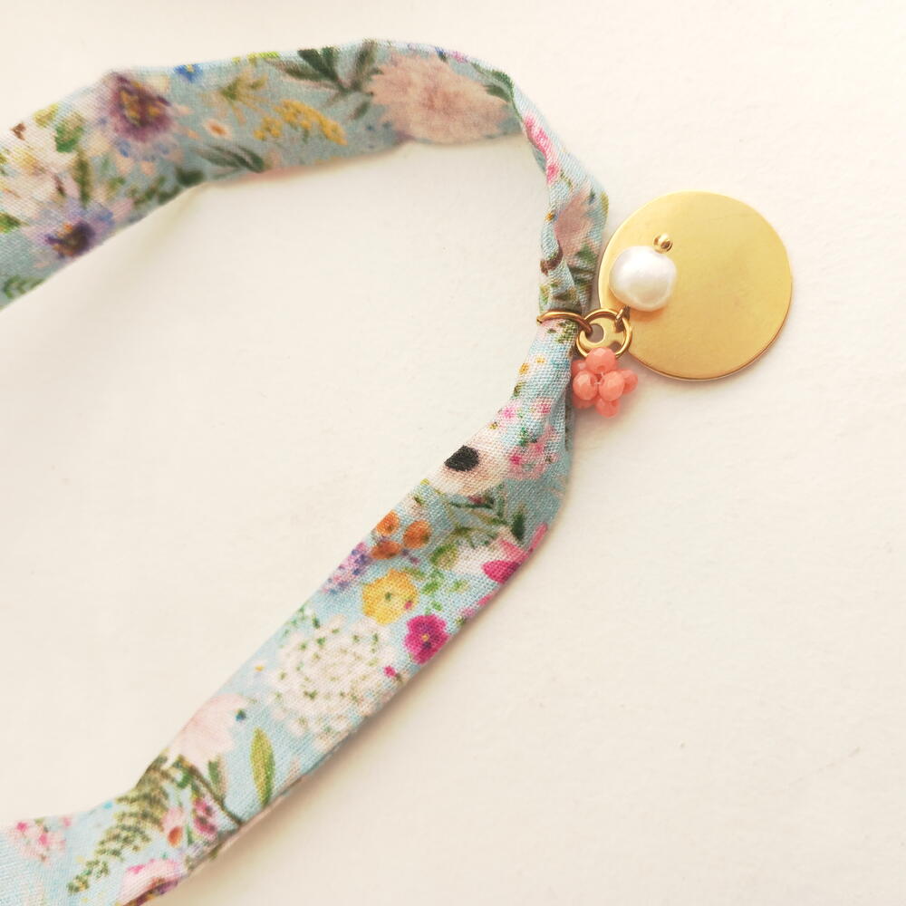 Acero inoxidable con baño oro Perla cultivada natural Collar tela estampa liberty Racimo mini cristalitos checos