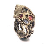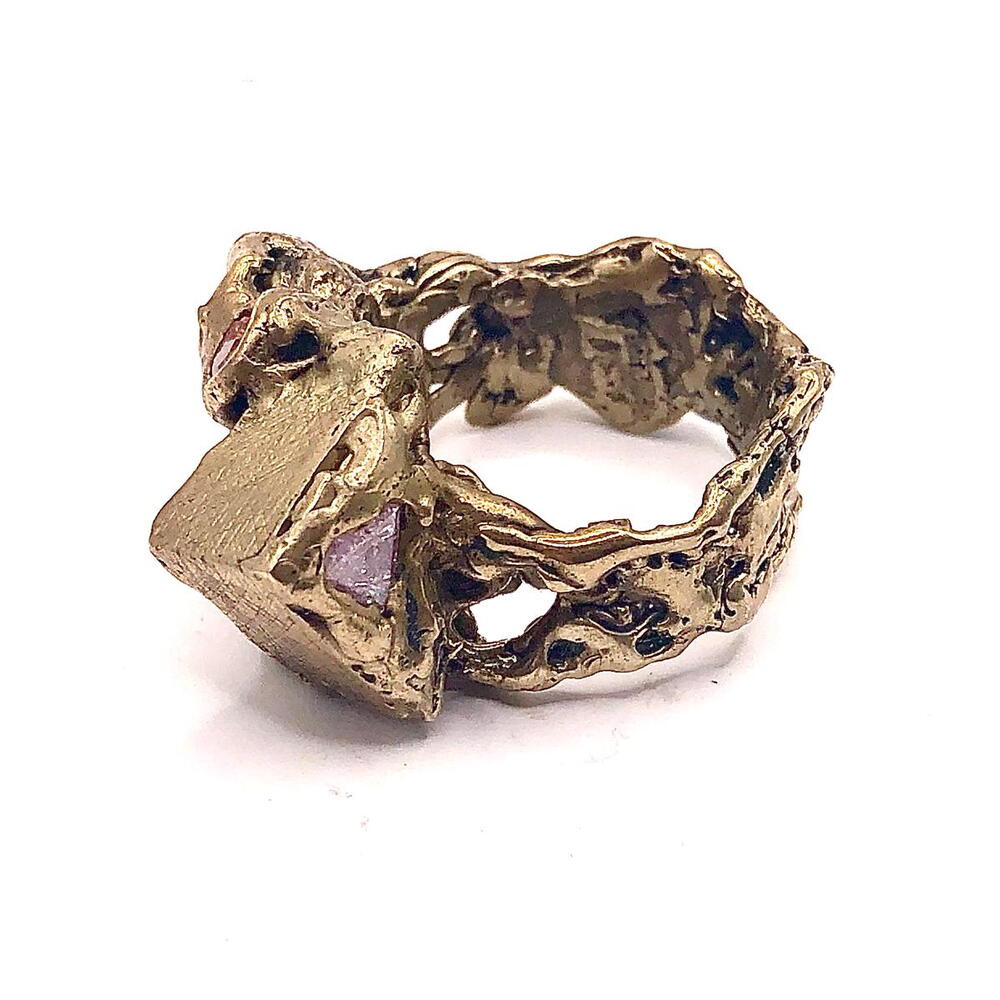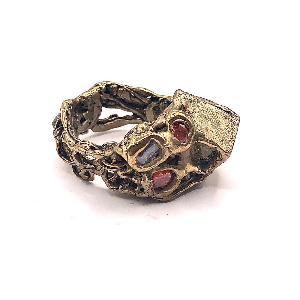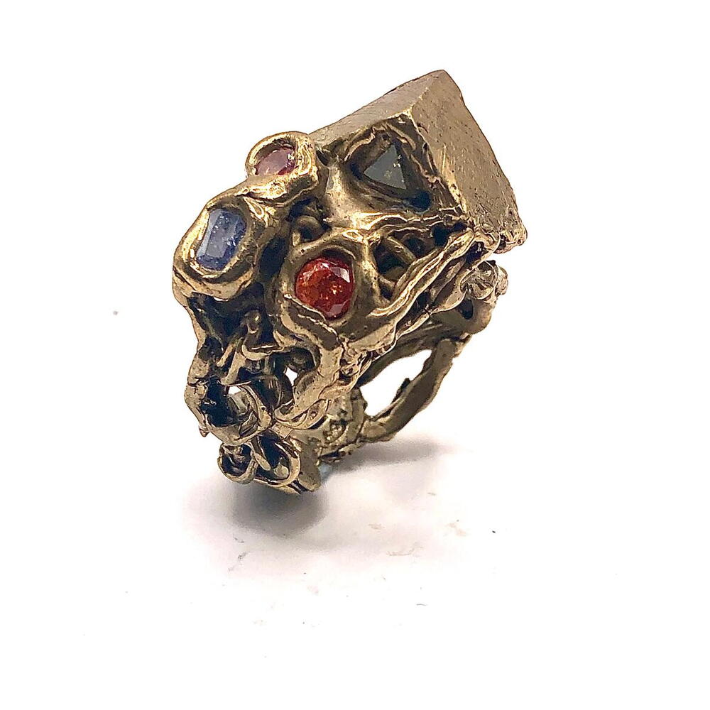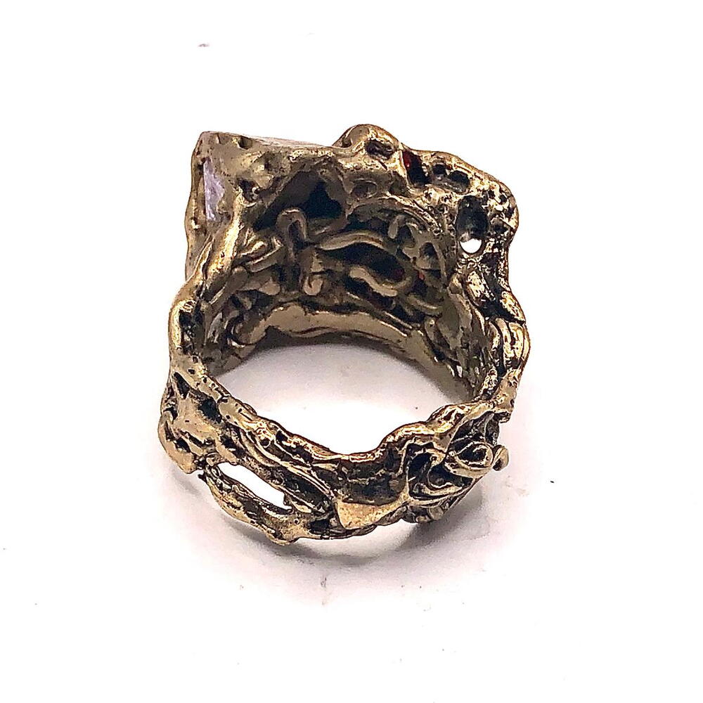 Anillo Colores de Gaudí: Un Viaje Escultórico al Modernismo Inspiración: 18,4mm = talla 18 de España = talla 8.5 de USA Este anillo, bautizado como Colores de Gaudí, es una oda a la genialidad del arquitecto catalán Antoni Gaudí. Su diseño, meticulosamente elaborado, captura la esencia del Modernismo barcelonés, fusionando formas orgánicas, una paleta de colores vibrante y una textura escultórica única. Detalles de Diseño: Estructura Orgánica y Escultórica: El anillo presenta una forma fluida y asimétrica, característica del estilo de Gaudí. No se trata de una banda tradicional, sino de una escultura miniatura que se enrosca alrededor del dedo. La superficie es rugosa y texturizada, evocando la naturaleza y la arquitectura de la Sagrada Familia. Mosaico de Gemas: Una explosión de color define la parte central del anillo. Gemas sintéticas de tonos intensos – rojo rubí, azul cobalto, verde esmeralda y transparente – están engastadas de forma irregular, creando un efecto de trencadís, el icónico mosaico de cerámica de Gaudí. Esta asimetría aporta dinamismo y vida a la pieza. Detalles Texturizados: La base del anillo, fundida en bronce macizo, presenta una textura única. Una parte superior plana y estriada contrasta con la forma orgánica del resto de la pieza. Esta rugosidad, lograda mediante la técnica de cera perdida, realza la artesanía y el carácter único del anillo. Atributos Estéticos: Material: Fundido en bronce de alta calidad, el anillo posee una pátina natural que evoca el oro antiguo, aportando calidez y nobleza a la pieza. Acabado: Un acabado satinado y texturizado resalta las imperfecciones deliberadas de la forja manual, garantizando que cada anillo sea una obra de arte única. Estilo: Este anillo es una pieza statement, ideal para quienes buscan una joyería de autor con personalidad y un profundo significado. Su diseño robusto y artístico se adapta a un estilo boho-chic, moderno o incluso vanguardista. En resumen: El anillo Colores de Gaudí es más que una joya; es una pequeña escultura que rinde homenaje a uno de los más grandes arquitectos de la historia. Su diseño orgánico, su mosaico de colores y su textura escultórica lo convierten en una pieza única y llena de significado, perfecta para quienes valoran el arte y la artesanía tradicional.