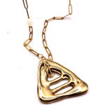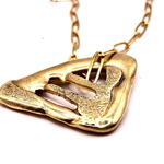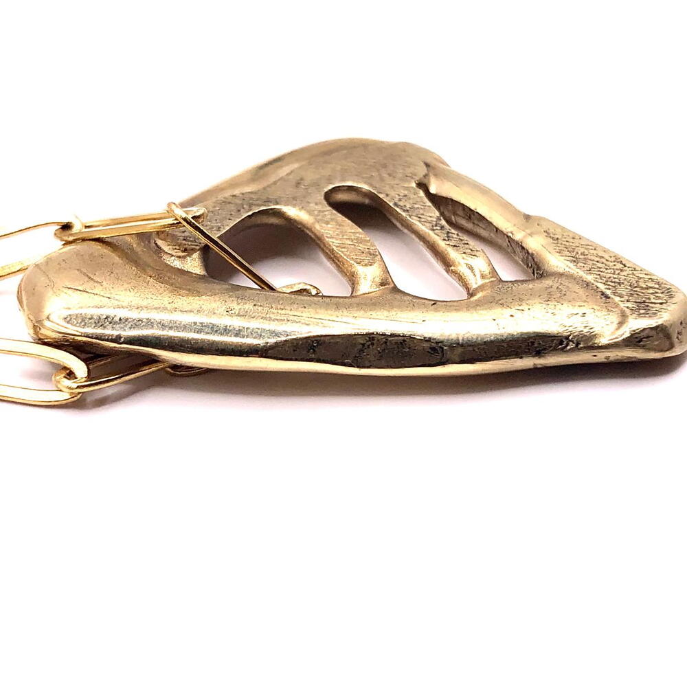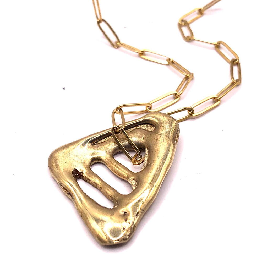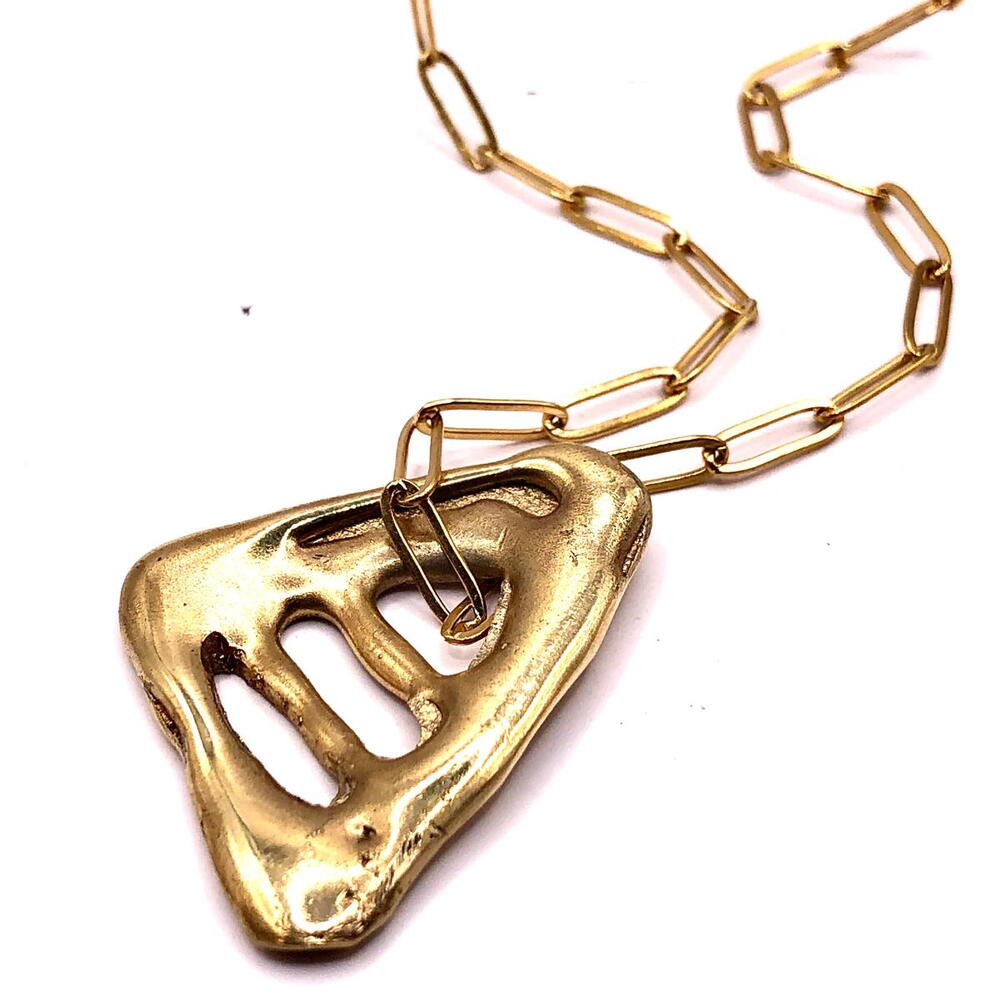 Colgante Triángulo Colgante Triángulo realizado en latón mediante la técnica de la cera perdida, un proceso artesanal que permite preservar texturas orgánicas, irregularidades y volúmenes únicos, haciendo que cada pieza sea irrepetible. Su forma triangular, abierta y fluida, se aleja de la geometría rígida para dialogar con lo orgánico. Evoca fragmentos naturales erosionados por el agua y el tiempo: piedra, hueso o restos marinos transformados en objeto escultórico. Las aberturas del diseño generan un juego sutil de luces y sombras que aporta profundidad y carácter. El colgante se presenta suspendido de una cadena de acero quirúrgico, un material resistente y duradero que contrasta con la calidez del latón y aporta equilibrio al conjunto. Una pieza con fuerte presencia, pensada para llevar como amuleto contemporáneo, donde materia, proceso y forma se encuentran desde la imperfección y la autenticidad. MEDIDA DEL DIJE: MAXIMO 45 MM