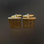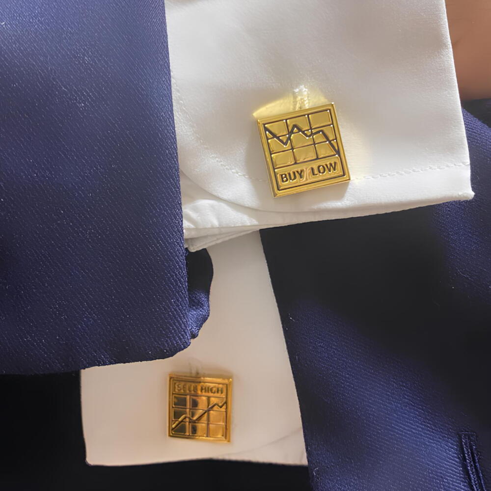 Gemelos dorados para camisa con el lema Buy Low Sell High con base de acero inoxidable de la colección finanzas. Dale un toque original a tus looks más formales.