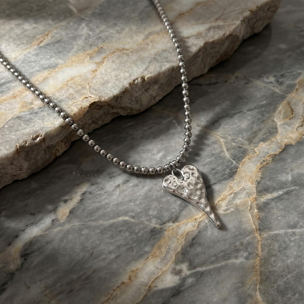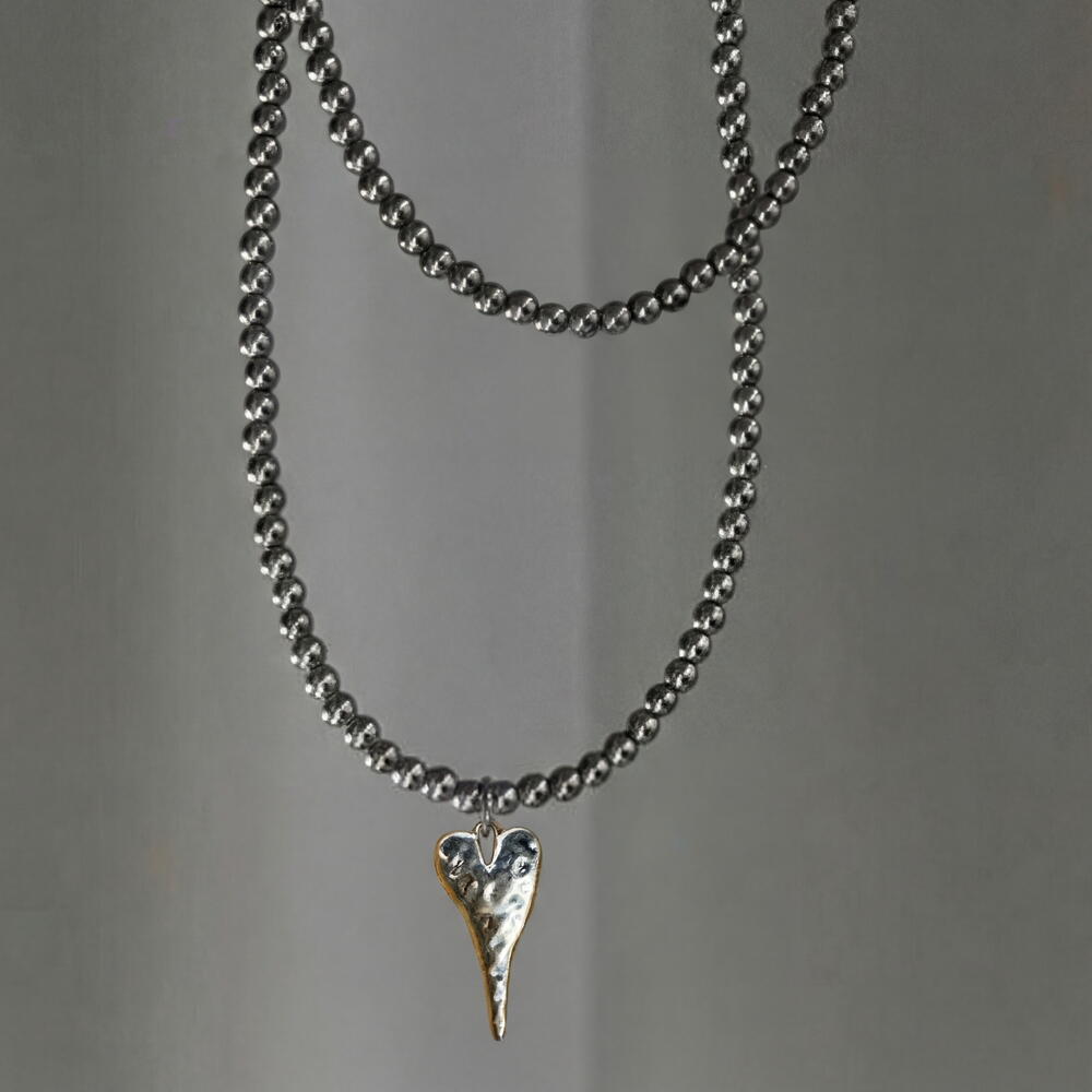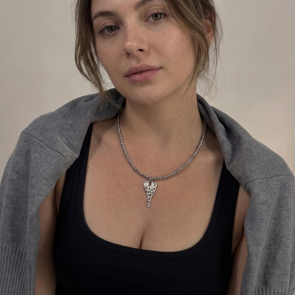 Un delicado collar miniatura con un colgante poco convencional en forma de corazón, cuya superficie está adornada con leves hendiduras e irregularidades texturizadas que recuerdan a los cráteres de la Luna. Estas suaves imperfecciones le confieren al colgante una sensación orgánica y natural — ligeramente asimétrico, táctil y lleno de carácter. Como un pequeño universo que reposa cerca de tu corazón, es un recordatorio romántico de que incluso las imperfecciones son las que hacen que el amor sea verdaderamente hermoso. ✔️ Herrajes de alta calidad e hipoalergénicos con baño de rodio ✔️ Alambre de acero inoxidable de calidad para joyería ✔️ Cuentas de hematita de 4 mm ✔️ Colgante de acero inoxidable y latón de 27 mm ✔️ Longitud: 38 cm + cadena de extensión de 5 cm La pieza se presenta en un embalaje listo para regalo con una bolsa protectora, perfecta para regalar o guardar de forma segura. Diseño del autor, hecho a mano. Esto significa que no encontrarás a nadie llevando exactamente la misma pieza.