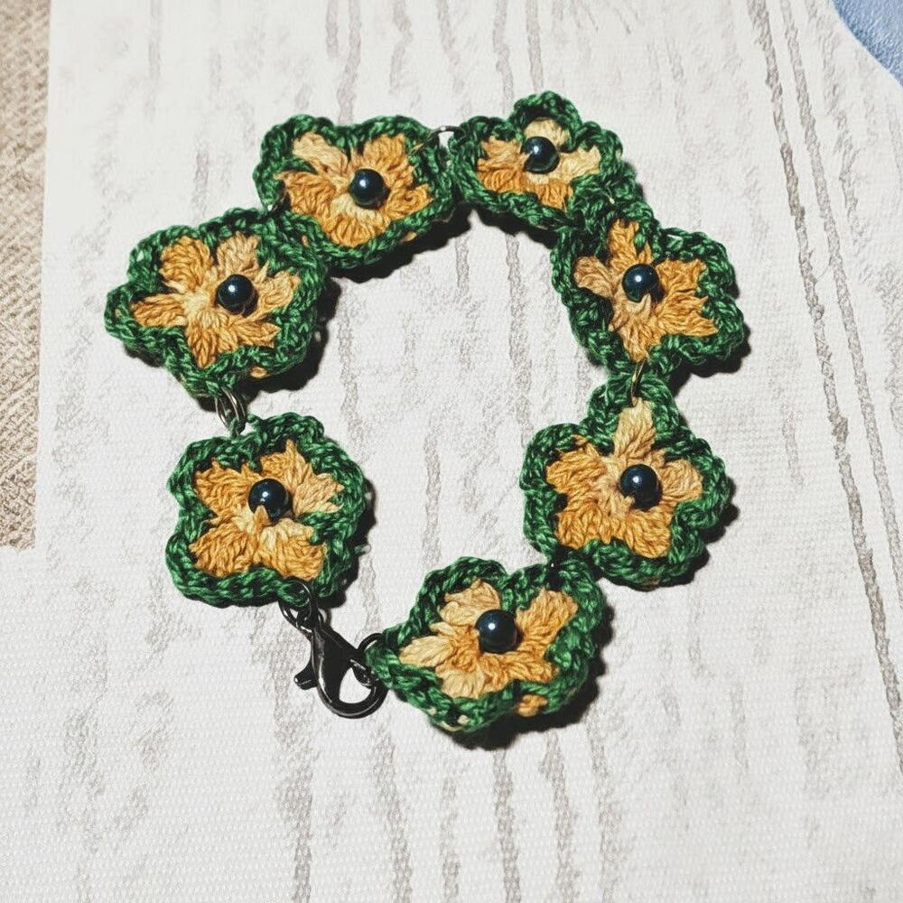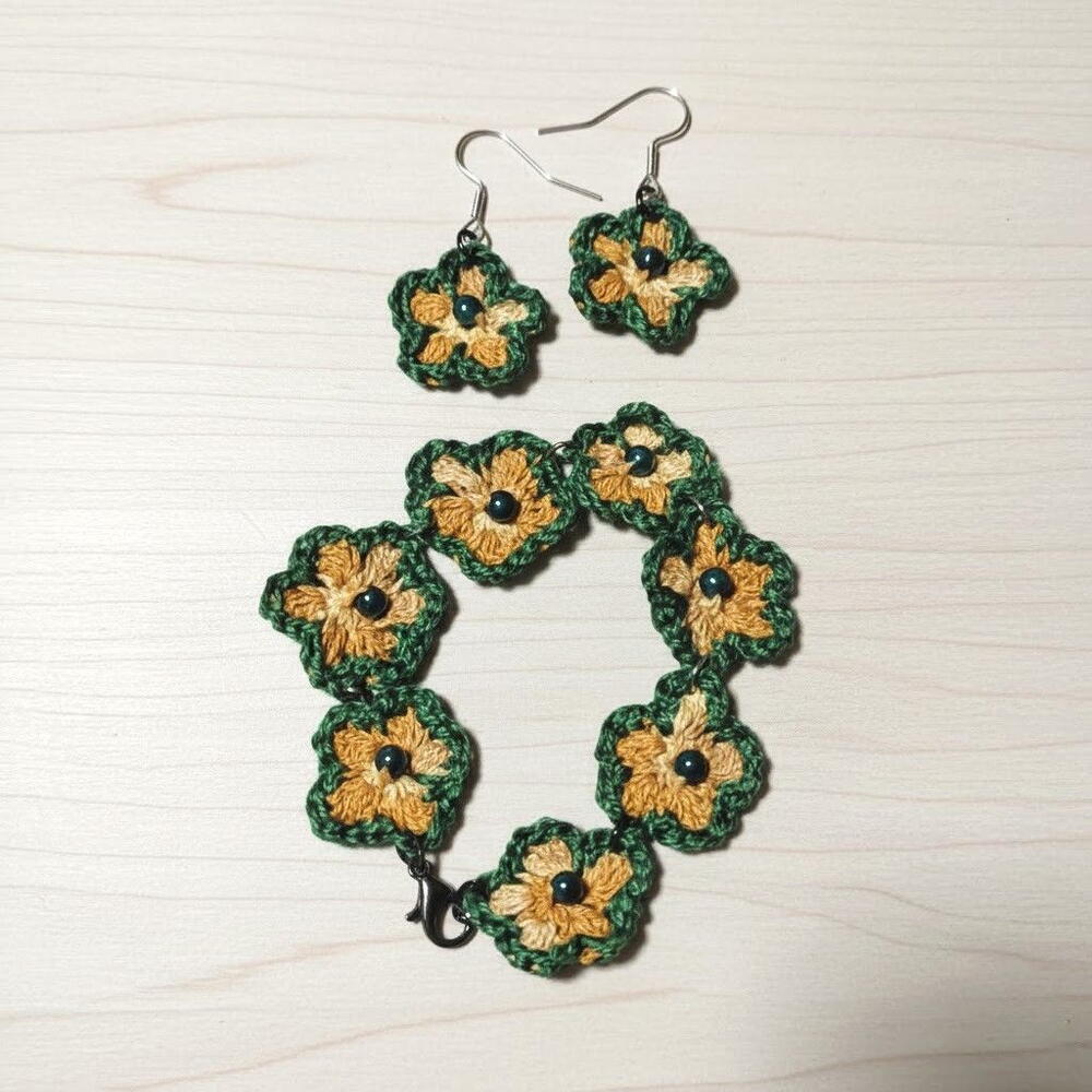 Este encantador conjunto tejido a ganchillo destaca por sus pequeñas flores artesanales que irradian calidez y un estilo natural único. Cada pieza está elaborada con dedicación, uniendo pétalos suaves en tonos mostaza y verde, decorados con cuentas oscuras que aportan un toque de contraste delicado. Los elementos metálicos de acero envejecido plateado añaden un aire vintage que combina perfectamente con el diseño artesanal. Es un regalo ideal para cumpleaños, Navidad, aniversarios o para sorprender a alguien amante de los accesorios hechos a mano. Gracias a su ligereza, el conjunto es cómodo para usar durante todo el día y aporta un detalle encantador a cualquier look. Para conservar su belleza, evita el contacto con agua, perfumes y guarda las piezas en un lugar seco; así mantendrán su forma y color durante mucho tiempo.