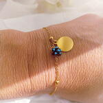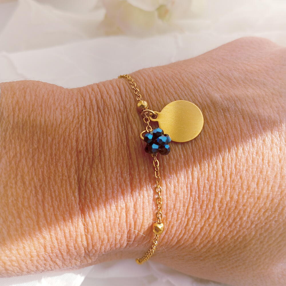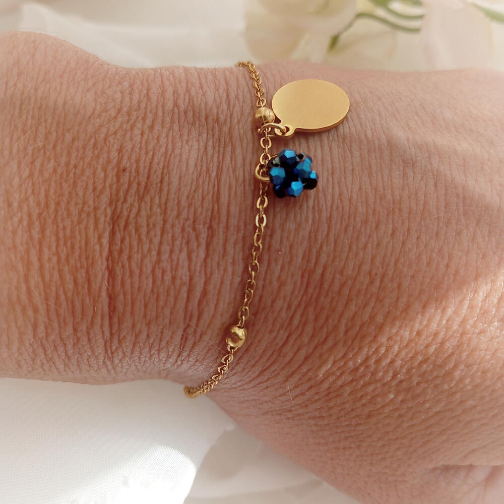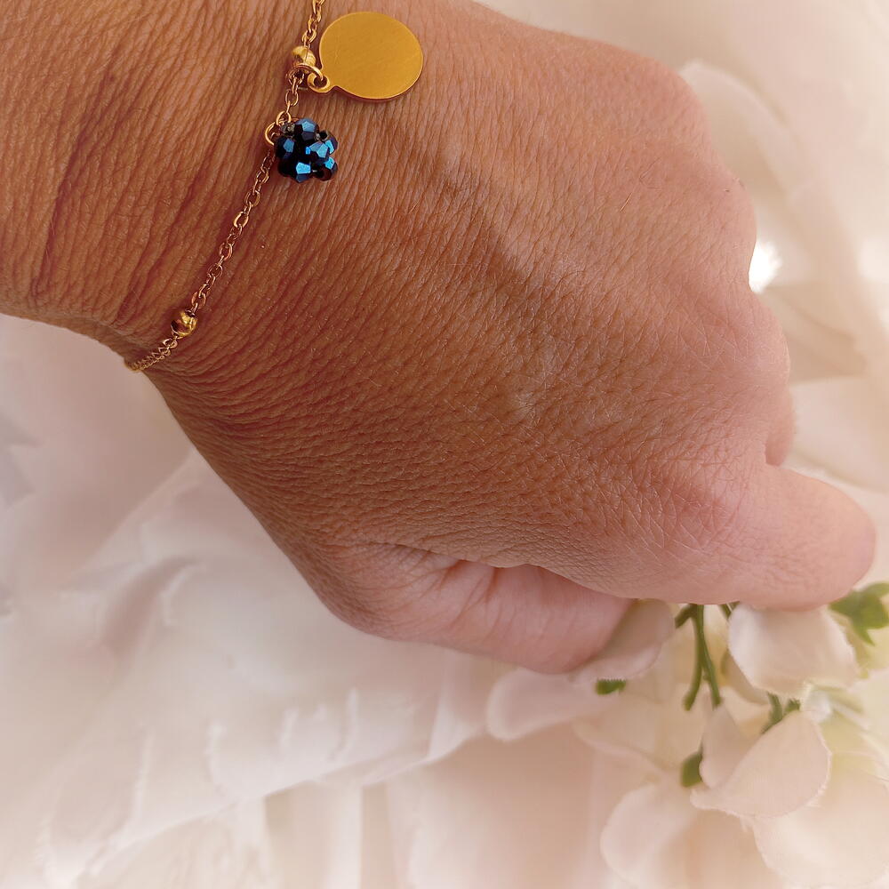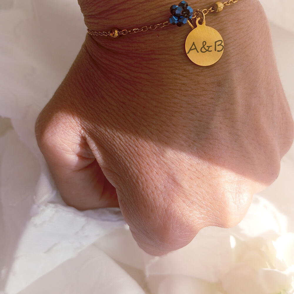 Hermosa Pulsera con Charm Personalizado con la frase que quieras dedicarle y del otro lado puede ir Iniciales! Tiene el bonito detalle del Racimo de Mini Cristalitos en azul.que le aporta Luz y color! Un regalo muy original y especial