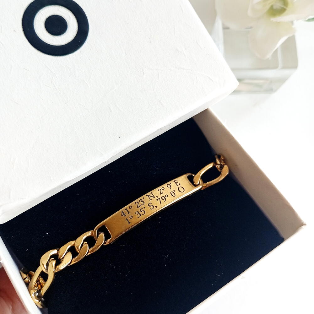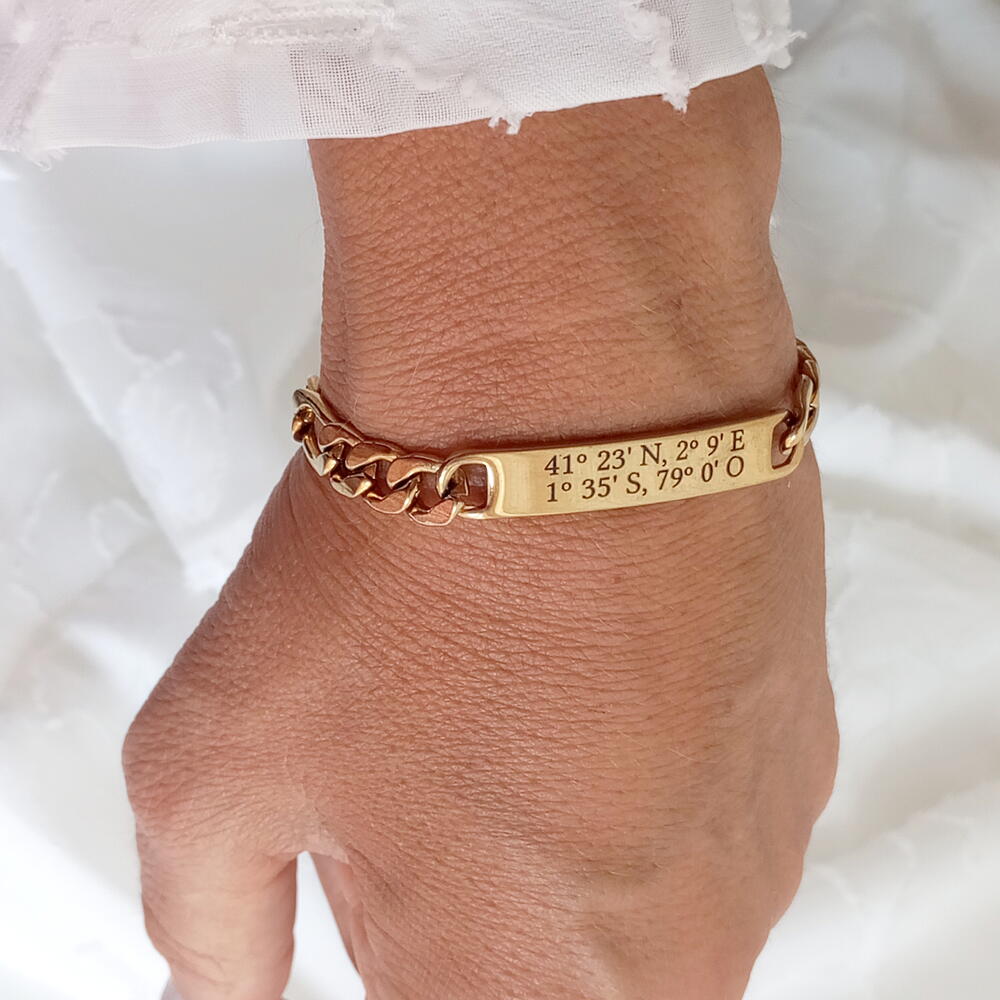 Elegante Pulsera Personalizada! Con lo que quieras, puede ir nombre, fecha, mensaje o como en la foto las coordenadas de la ubicación! El detalle Perfecto para estar mas cerca de esa perosna especial para ti.