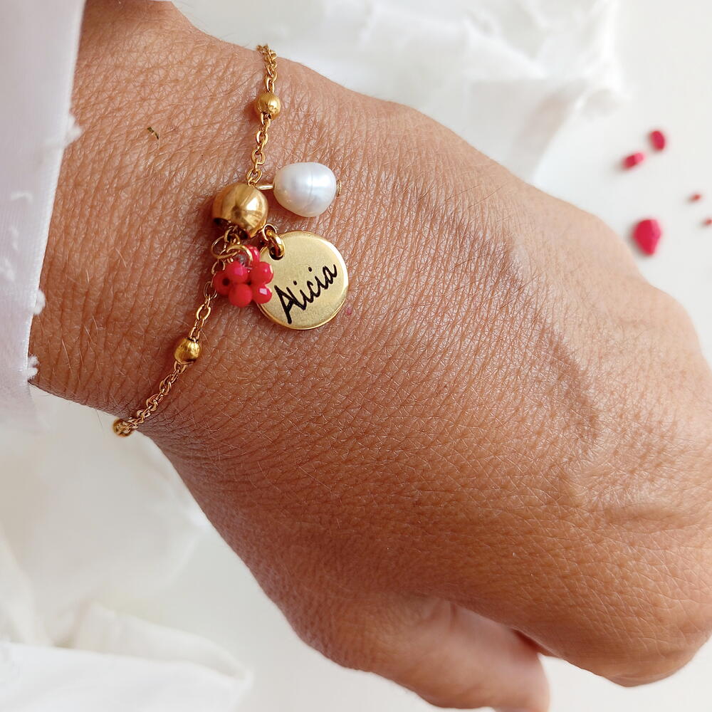 Hermosa y delicada Pulsera Personalizada con detalles únicos. La podemos personalizar con Nombre de un lado de la medalla y del otro lado Con el dibujo o símbolo que tú quieras!