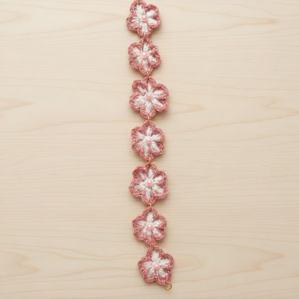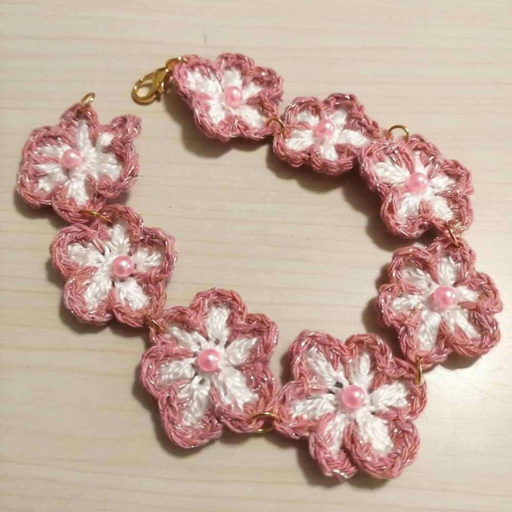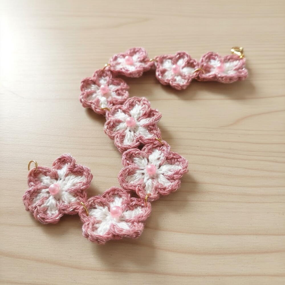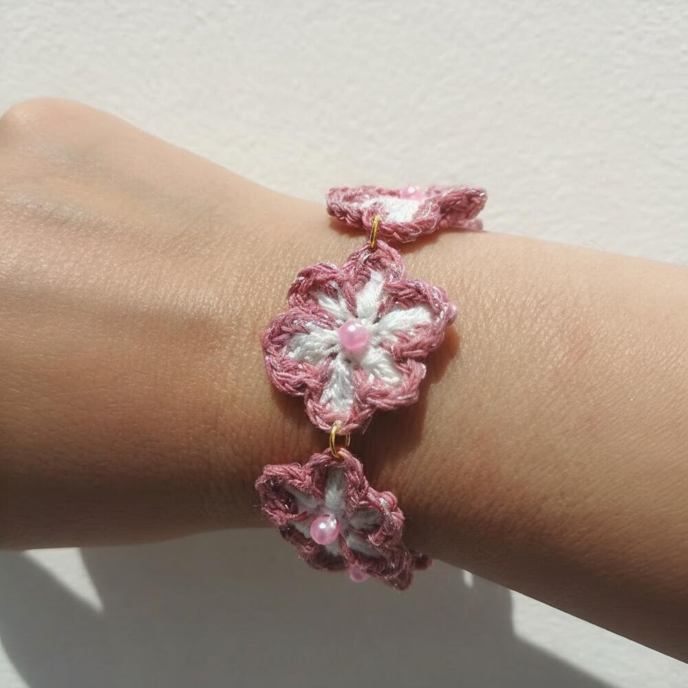 Este delicado brazalete hecho a mano destaca por sus flores tejidas a ganchillo, que aportan un encanto suave y artesanal a cualquier estilo. Sus tonos rosados y blancos se combinan armoniosamente, creando una pieza dulce y femenina. Cada flor está decorada con una pequeña cuenta que añade un toque de brillo y detalle. La cadena y los enganches de metal dorado realzan el diseño, dándole un acabado elegante y luminoso. Es un accesorio perfecto para regalar en cumpleaños, San Valentín, Navidad o simplemente para sorprender a alguien especial con un detalle único. Para conservarlo en perfectas condiciones, evita el contacto con el agua, perfumes o productos químicos, y guárdalo en un lugar seco cuando no lo uses. Límpialo suavemente con un paño seco si es necesario.