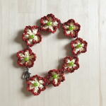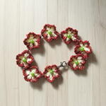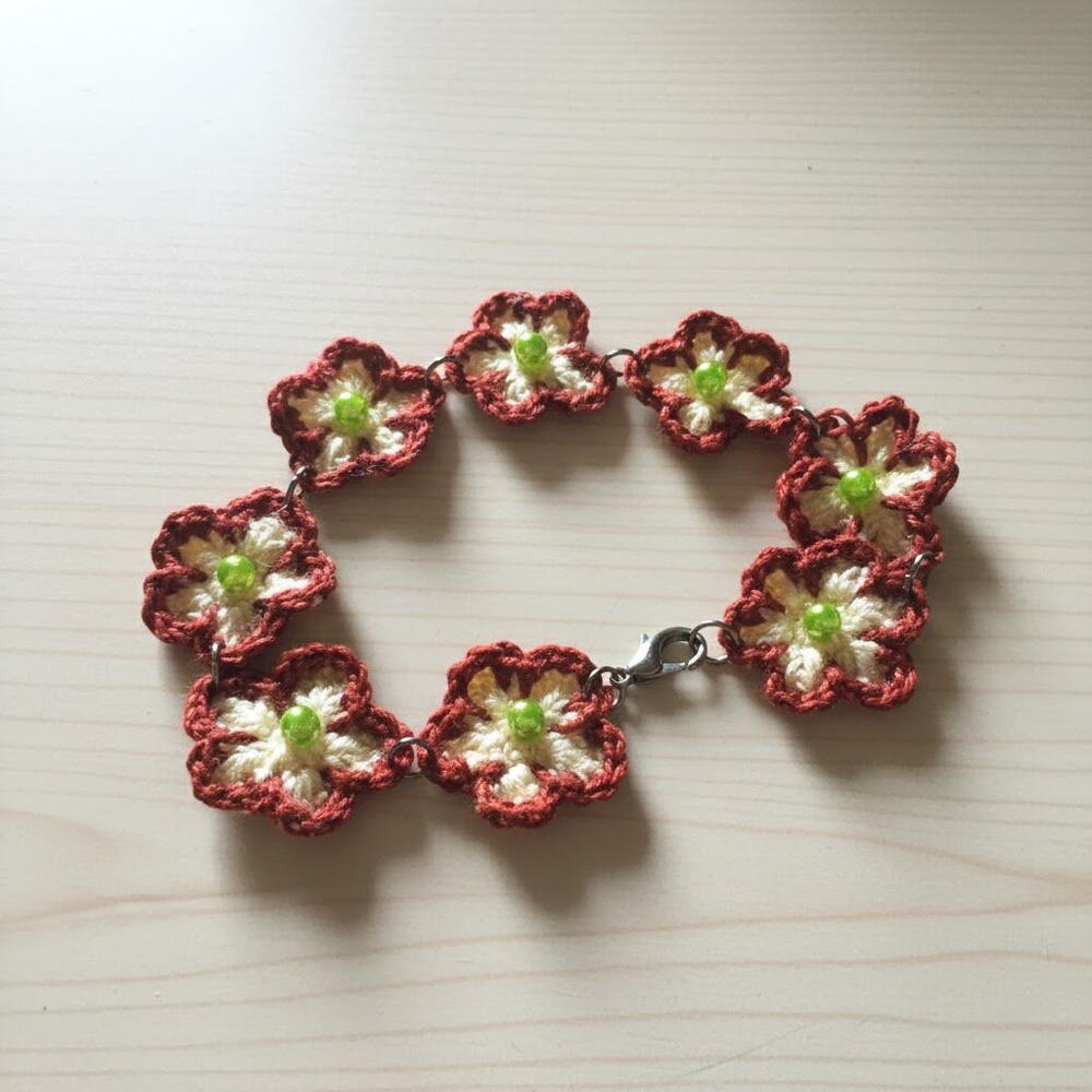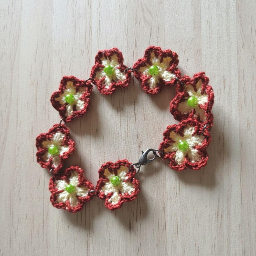 Este delicado brazalete tejido a crochet destaca por sus pequeñas flores artesanales, llenas de encanto y personalidad. Los tonos cálidos y naturales crean una pieza luminosa que aporta un toque romántico a cualquier estilo. Cada flor está decorada con una cuenta verde suave en el centro, lo que añade un brillo discreto y elegante. Los componentes metálicos, hechos de acero plateado envejecido, complementan el diseño con un aire vintage muy especial. Es un regalo perfecto para cumpleaños, Día de la Madre, Navidad o simplemente para sorprender a alguien con algo único y hecho a mano. Para mantener la pieza en perfecto estado, evita mojarla, guárdala en un lugar seco y límpiala suavemente con un paño blando cuando sea necesario.