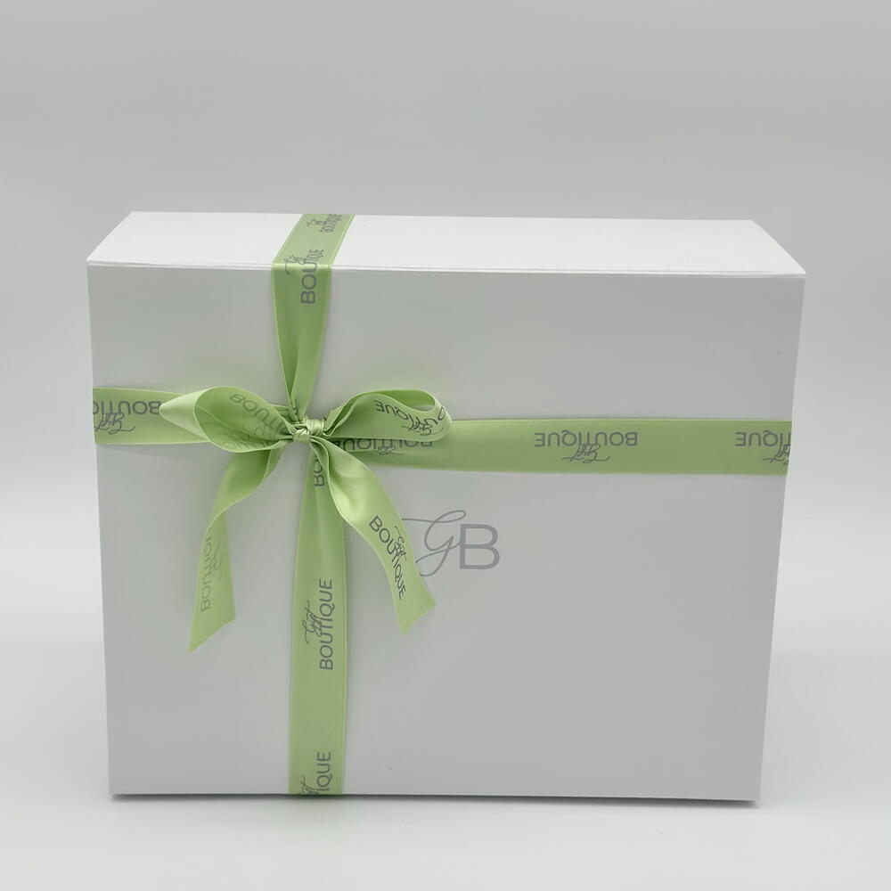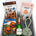 Una cesta de regalo para perros cuidadosamente preparada que incluye una selección de golosinas y juguetes. Contiene snacks envasados (golosinas con forma de rosquilla Dokas y bocaditos de cerdo y yogur Yogupet), un par de pelotas de goma resistentes Chuckit, un juguete de cuerda y una botella de bebida apta para perros "Cheers & Pet", todo presentado en una caja blanca con lazo.