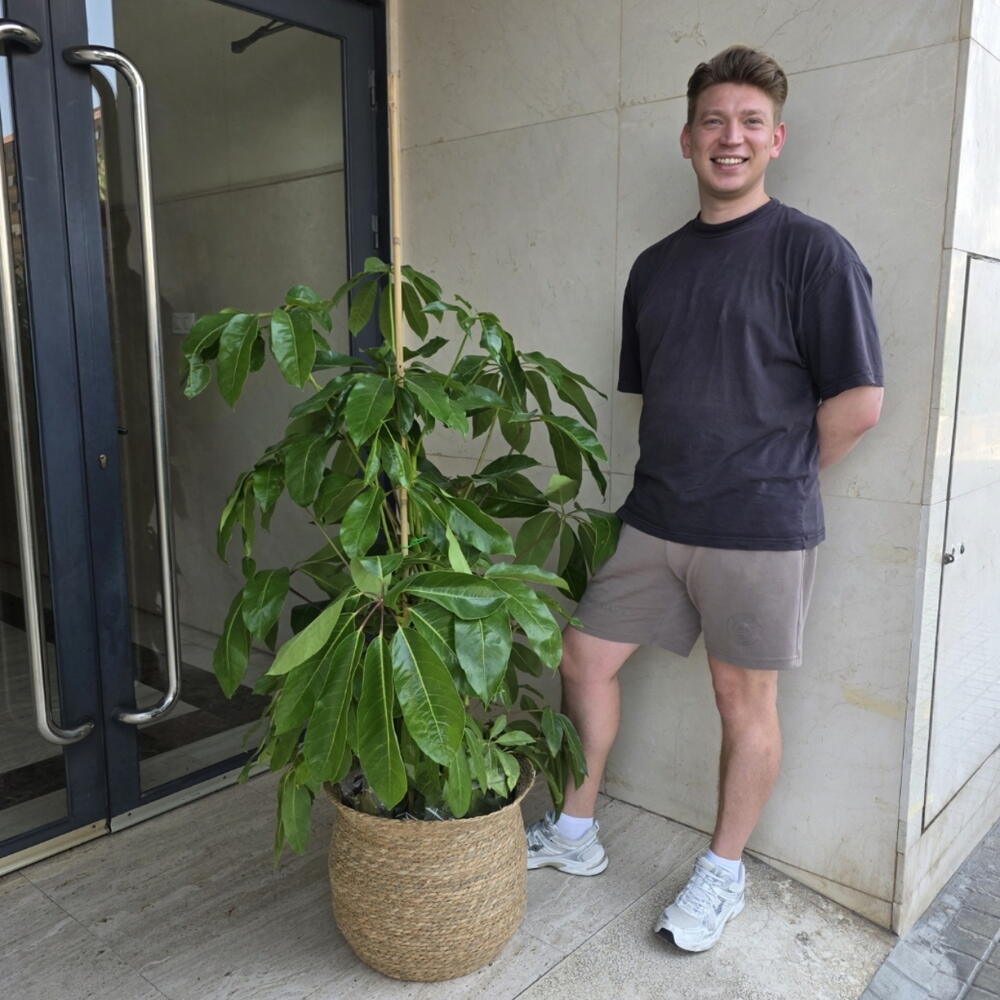 La **Actinophylla**, también conocida como **Schefflera** o árbol paraguas, es una planta tropical originaria de Australia y Nueva Guinea. Se caracteriza por sus hojas brillantes, grandes y compuestas, que se abren en forma de abanico, parecidas a los radios de un paraguas. Es muy popular como planta de interior por su resistencia y su aspecto exótico. Puede alcanzar varios metros de altura en condiciones ideales, aunque en interiores suele mantenerse más compacta. Además de ser decorativa, ayuda a purificar el aire. Es una opción ideal para hogares y oficinas gracias a su fácil mantenimiento y elegancia natural.